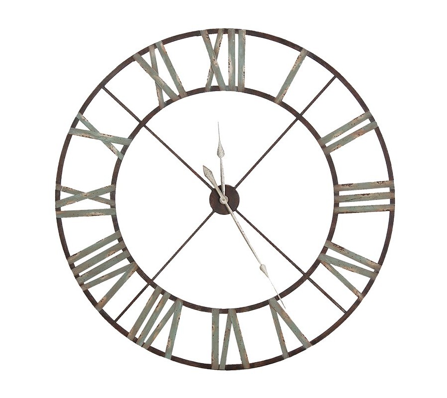 Vintage kovové šedé nástěnné závěsné hodiny Sindy s patinou a římskými číslicemi v kulatém tvaru 122 cm