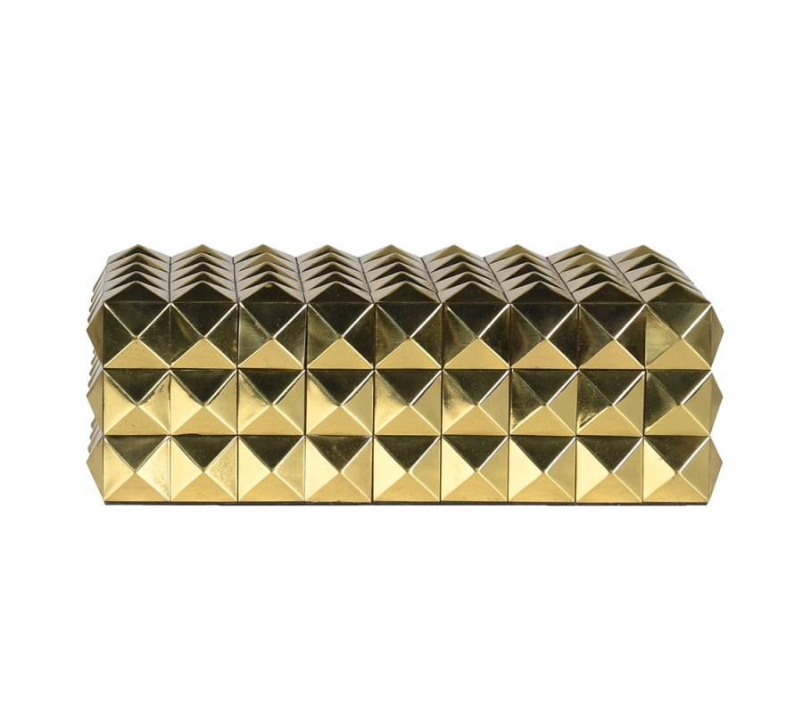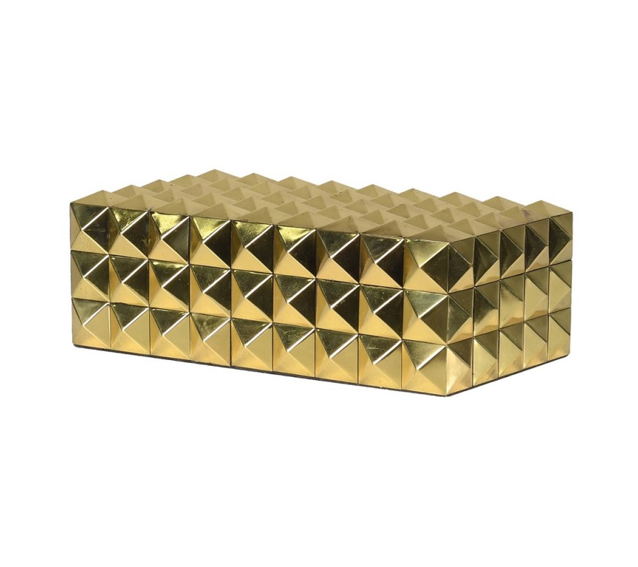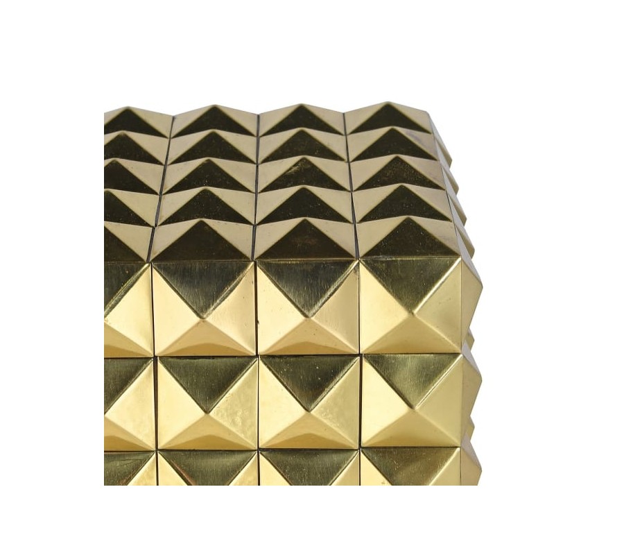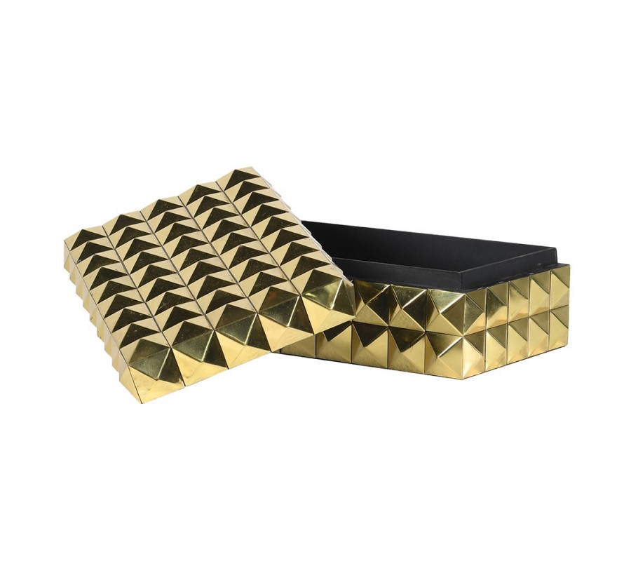 Vnější povrch šperkovnice je vyroben z kovu a pokryt lesklou zlatou povrchovou úpravou, kterou tvoří reliéf z drobných plastických jehlanů. Tento geometrický vzor vytváří efektní hru světla a stínu a je typickým znakem art deco designu. Kovová konstrukce dodává šperkovnici pevnost, váhu a pocit kvality, který odpovídá jejímu luxusnímu provedení.