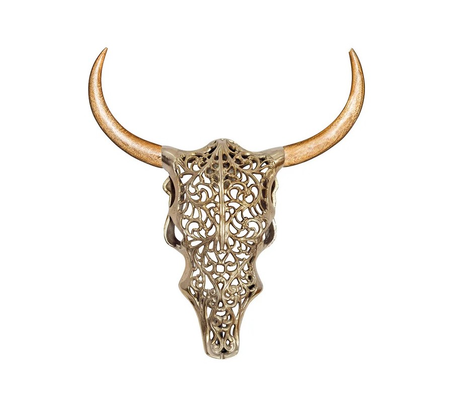 Dekorace je vyrobena z kovu a má siluetu býčí lebky. Její tvar je symetrický a zjednodušený, což působí moderním dojmem. Hrubší okraje vyplňuje delikátní ornamentální vzor s florálními motivy, inspirovaný orientálním stylem. Provedení ve zlaté barvě dotváří exkluzivní vizuál a výborně s ním koresponduje teplá hnědá barva mangového dřeva, ze kterého jsou vyrobeny mohutné zahnuté rohy. Jejich povrch je hladký, se zachovanou strukturou dřeva. Ruční zpracování dodává každému kusu unikátní charakter.