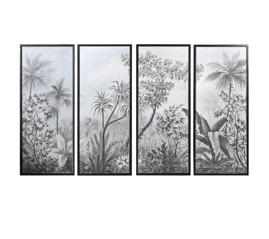 Sada obrazů Botanical Noir přináší do interiéru eleganci a nadčasovou estetiku s jemným nádechem vintage a retro stylu. Kolekci tvoří čtyři obdélníkové panely, které společně vytvářejí harmonický botanický motiv s detailně zpracovanou kresbou tropické vegetace v odstínech šedé, černé a bílé.