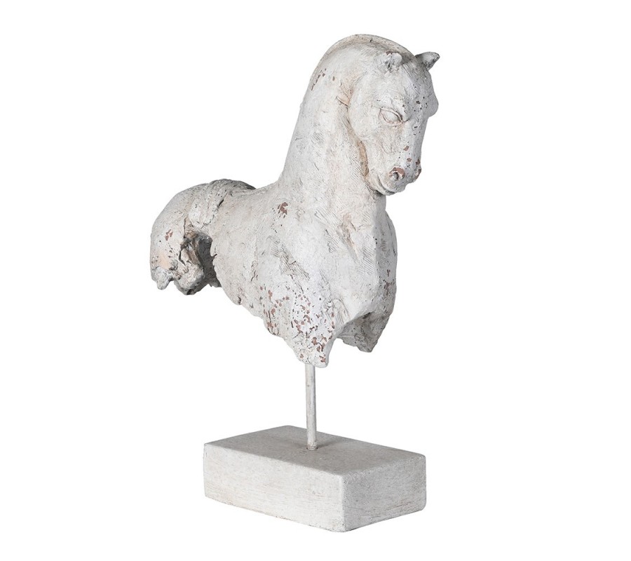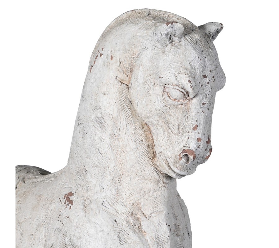 Socha je vyrobena z magnezie, díky čemuž má pevný, kamenný dojem a kvalitní zpracování detailů. Silueta koně je ztvárněna klidně a ušlechtile, s důrazem na tvar hlavy, krku a linie těla. Zajímavým designovým prvkem je záměrně zjednodušené provedení, kde kůň nemá kompletní spodní část těla – působí jako historický artefakt poznačený časem.