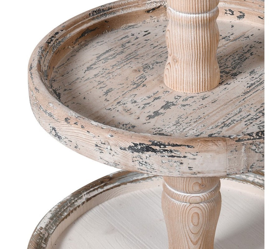 Působivý vintage stojan Classic Tier představuje elegantní doplněk s venkovským charakterem a precizně propracovanými detaily. Vyrobený z kvalitního masivního dřeva, vyniká přirozenou texturou a pevným zpracováním. Jeho čtyři kulaté police s vyvýšeným okrajem jsou uspořádány od největší ve spodní části po nejmenší nahoře, čímž vzniká harmonická a vyvážená silueta. Středová vyřezávaná tyč v krémové barvě působí elegantně a ladí s celkovým tvarem. Spodní dvě police s jemnou bílou patinou kontrastují s vrchními v přírodním hnědém odstínu, což vytváří efekt autentického dřeva s jemně ošoupaným povrchem. Kabriolové nožičky v krémové barvědodávají stoj