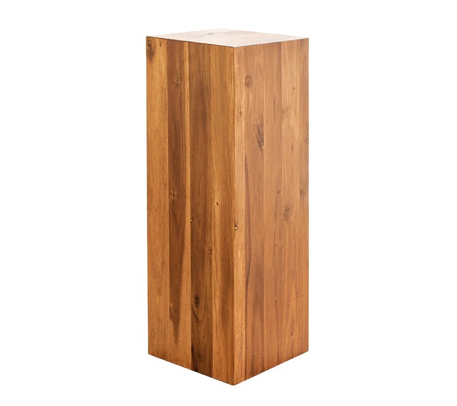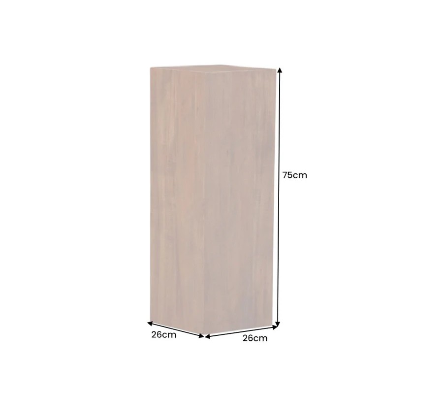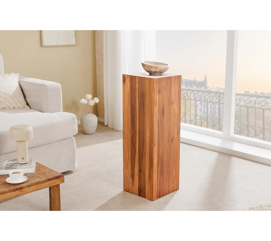 V interiéru se uplatní jako podstavec pro sochy, vázy, dekorace, pokojové rostliny či menší lampy. Skvěle zapadne do venkovských, přírodních, rustikálních, etno i moderních minimalistických prostor, kde dřevo hraje dominantní roli. Jednoduché linie umožňují jeho kombinování s masivními stoly, příručními stolky nebo komodami z teakového či akáciového dřeva. Výborně ladí s doplňky v černé, krémové, béžové, olivové, medové nebo bronzové barvě.