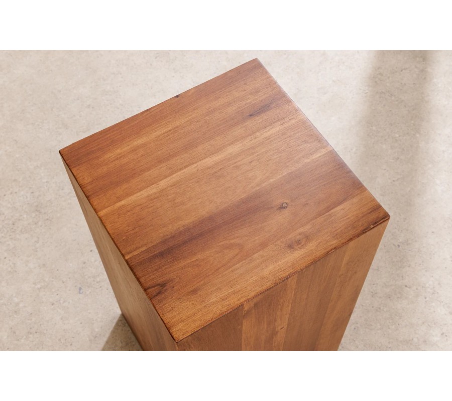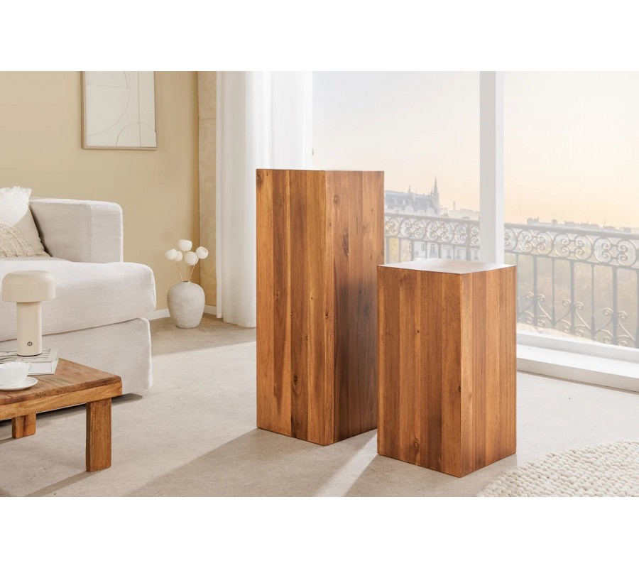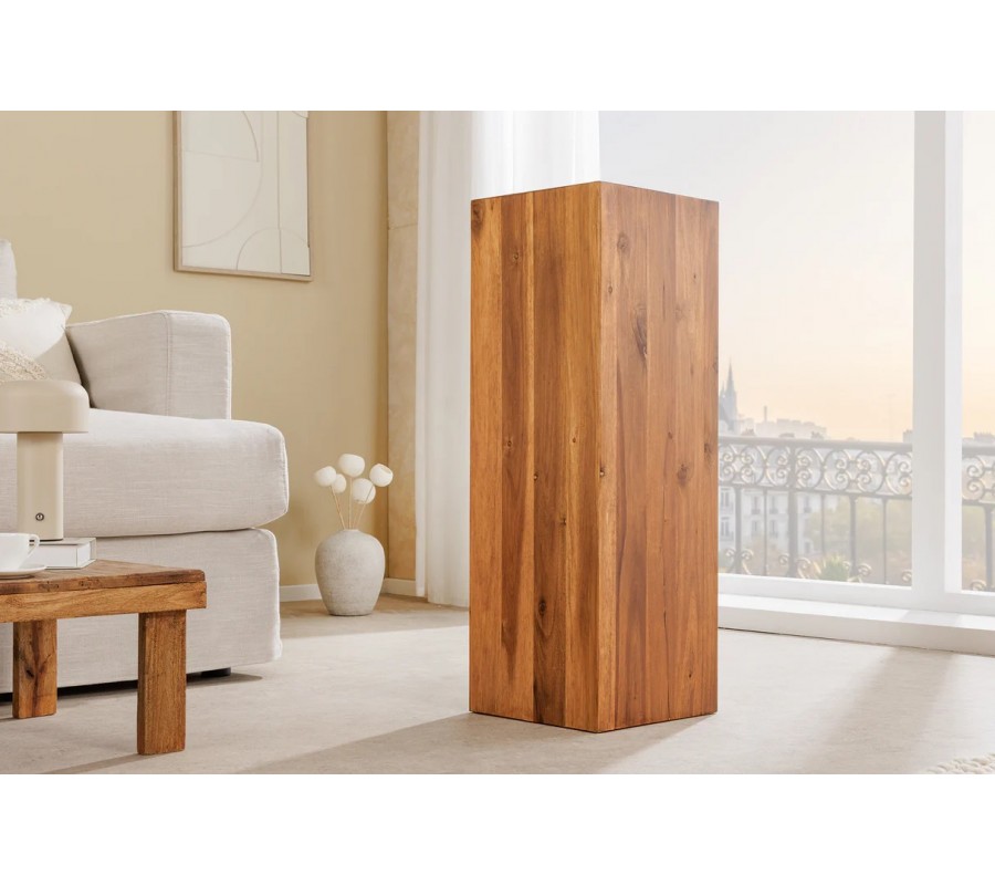 Masivní venkovský podstavec Horaz vytváří pevný, elegantní a mimořádně přirozený akcent v prostoru. Je zhotoven z akáciového dřeva, které je známé svou hustotou, trvalostí a exkluzivním charakterem. Povrch zdobí výrazná dřevěná kresba s kontrastními letokruhy, které mu dodávají autentický přírodní vzhled typický pro ručně zpracované kusy kvalitního nábytku. Kvadrový tvar s čistými liniemi působí moderně, ale zároveň se nese v duchu teplé venkovské estetiky.