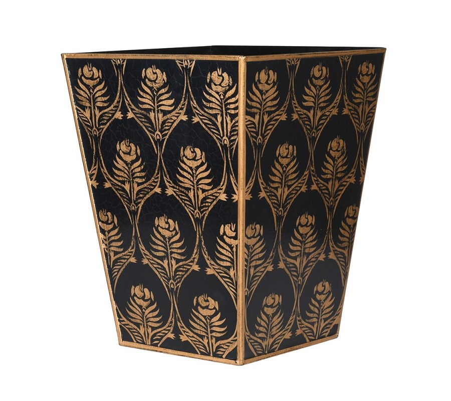 Dekorativní koš Elorien má čtvercový půdorys, přičemž se směrem k vrchní části mírně rozšiřuje, což mu dodává elegantně vyvážené proporce a stabilní vzhled. Je vyroben ze železa s černým lakováním, které působí luxusně a zároveň zvýrazňuje zlaté detaily na povrchu.