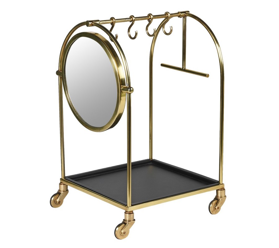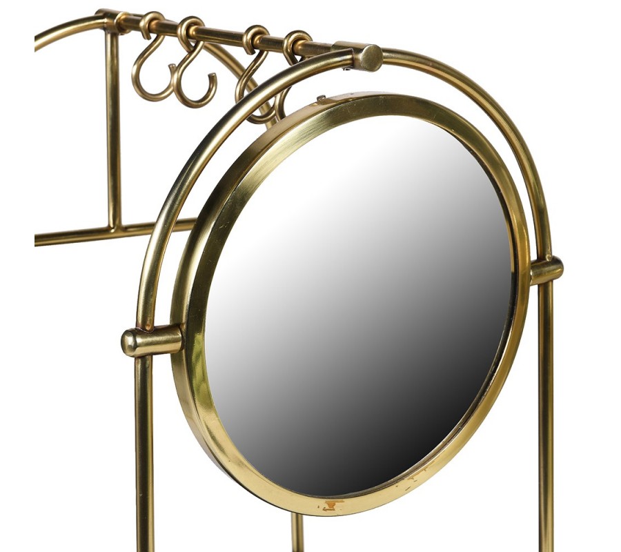 Art deco zlatý věšák na kolečkách Arcondo s kulatým zrcadlem se čtyřmi háčky se čtvercovou policí 42 cm