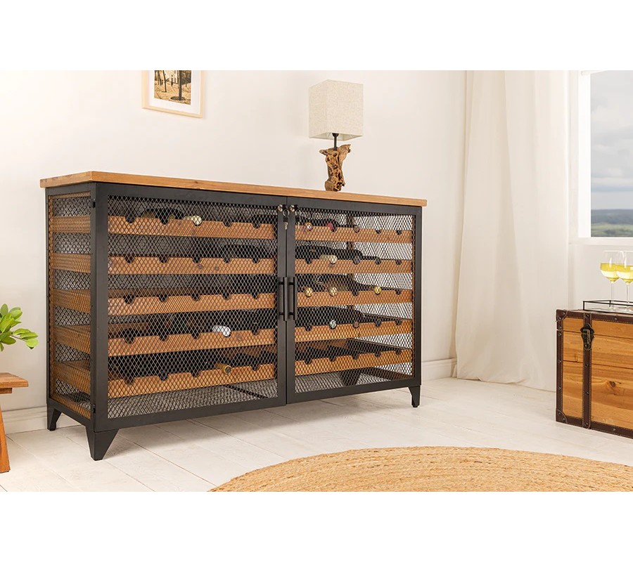 Moderní industriální vinotéka Crawley je výrazným spojením masivního jedlového dřeva hnědé barvy a černé kovové konstrukce, které dohromady vytvářejí autentický loftový charakter. Robustní industriální vzhled kovu je zjemněn světle hnědým odstínem výsuvných dřevěných zásuvek, díky čemuž vinotéka působí vyváženě, nadčasově a stylově.
