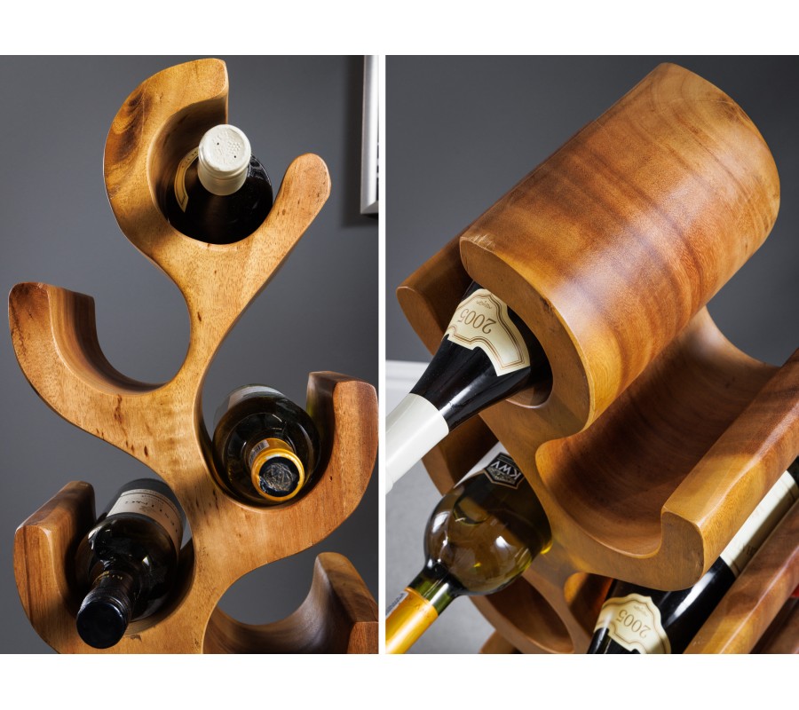 Designový stojan Milena, vyrobená z exotického lakovaného dřeva Suar, představuje stylový a originální přírůstek do vašeho obývacího pokoje nebo baru. Unikátní kousek nábytku je navržen tak, aby připomínal pokojovou rostlinu, což dodává jeho designu poutavý a hravý vzhled. Jednotlivá místa na odložení až 12 lahví vína jsou navržena tak, aby imitovala listy rostliny, což umožňuje nejen praktické, ale také esteticky příjemné uložení vašich oblíbených vín.