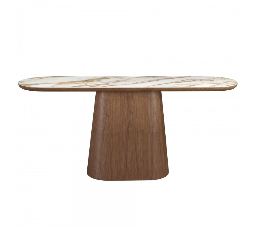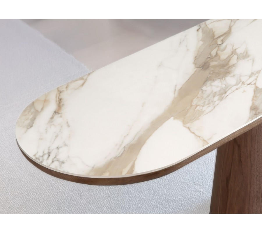 Luxusní moderní oválný konzolový stolek Vita Naturale deskou s bílým mramorovým designem a ořechovou hnědou podstavou 180 cm