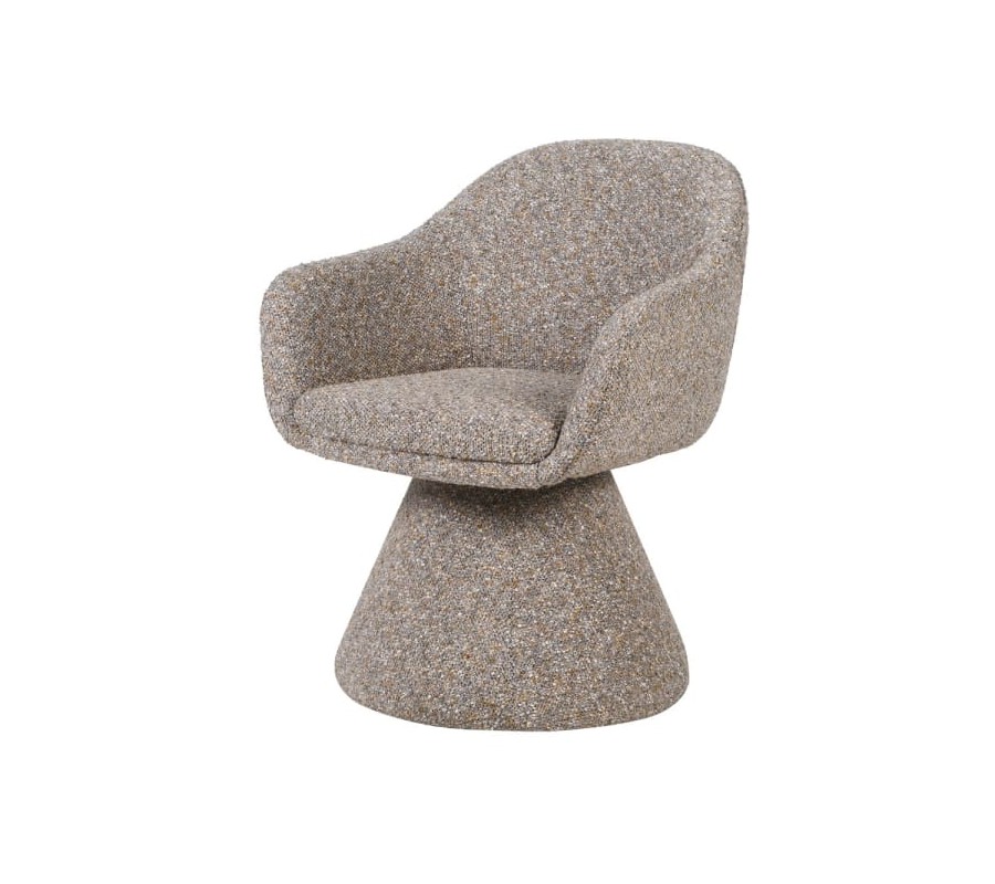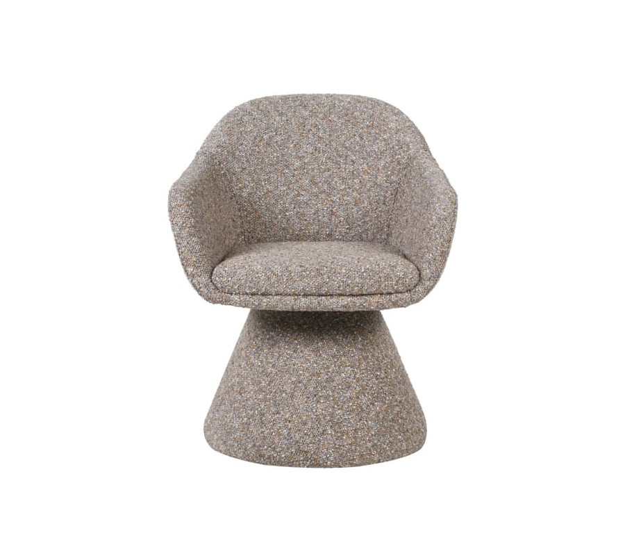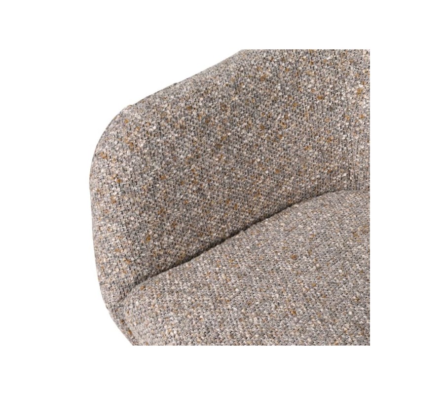Celý povrch židle pokrývá béžová melírovaná textilie s jemnou strukturou, která působí teplo, přirozeně a nadčasově. Boční opěrky plynule přecházejí do zádové části, čímž vzniká elegantní jednolitý tvar bez rušivých linií. Tenké, oblé opěrky opticky odlehčují celou siluetu a podtrhují její designovou čistotu.