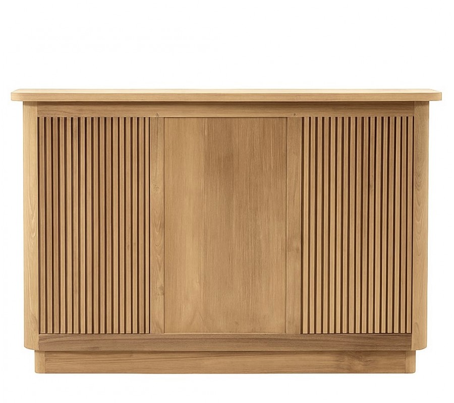Čelo pultu o výšce 108 cm je na fasádě předěleno na tři panely. Střední je hladký a vyniká na něm struktura dřeva, zatímco boční zdobí vyřezávaný vertikální lamelový reliéf, který přináší do designu nádech art deco estetiky. Rohy jsou výrazně zaoblené, což působí elegantním retro dojmem. Stabilitu zajišťuje plná obdélníková podstava s menším průměrem, která vizuál jemně odlehčuje.