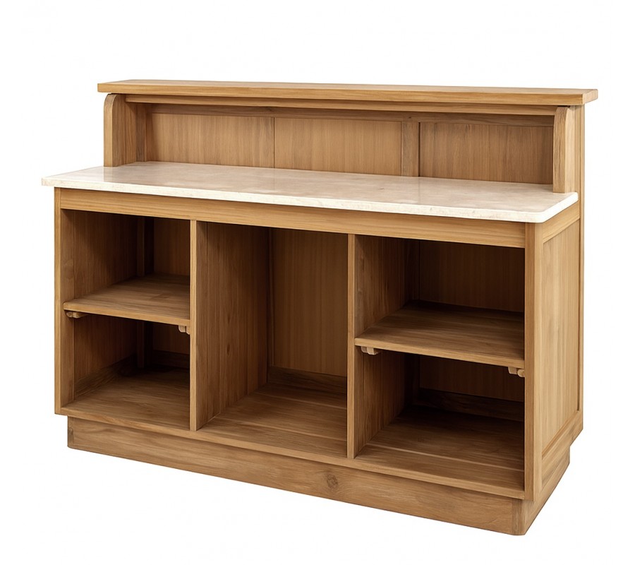 Barový pult je vyroben z masivního teakového dřeva v naturálním světlém hnědém provedení s jemnou kresbou letokruhů. Odstín působí bohatým teplým dojmem a podtrhuje přírodní charakter materiálu. Dřevo je zároveň mimořádně pevné a odolné vůči vlhkosti a vlivům každodenního používání.