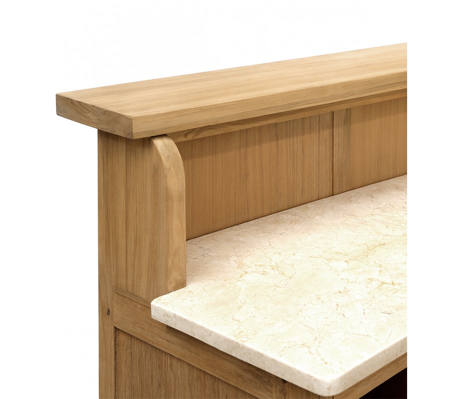 Zadní stranu pultu tvoří nižší úložný prostor s jednou vysokou policí uprostřed a dvěmi polovičními policovými místy na každé straně. Jeho vrchní část je překryta mramorovou doksou v bílém až krémovém odstínu se subtilním žilkováním. Kámen se krásně propojí s naturálním vizuálem dřeva a zároveň působí luxusním dojmem,