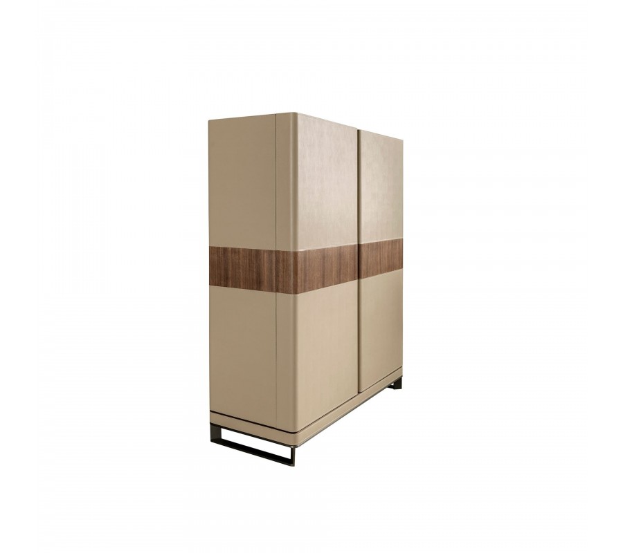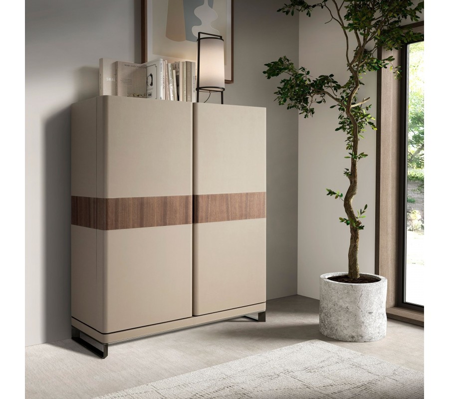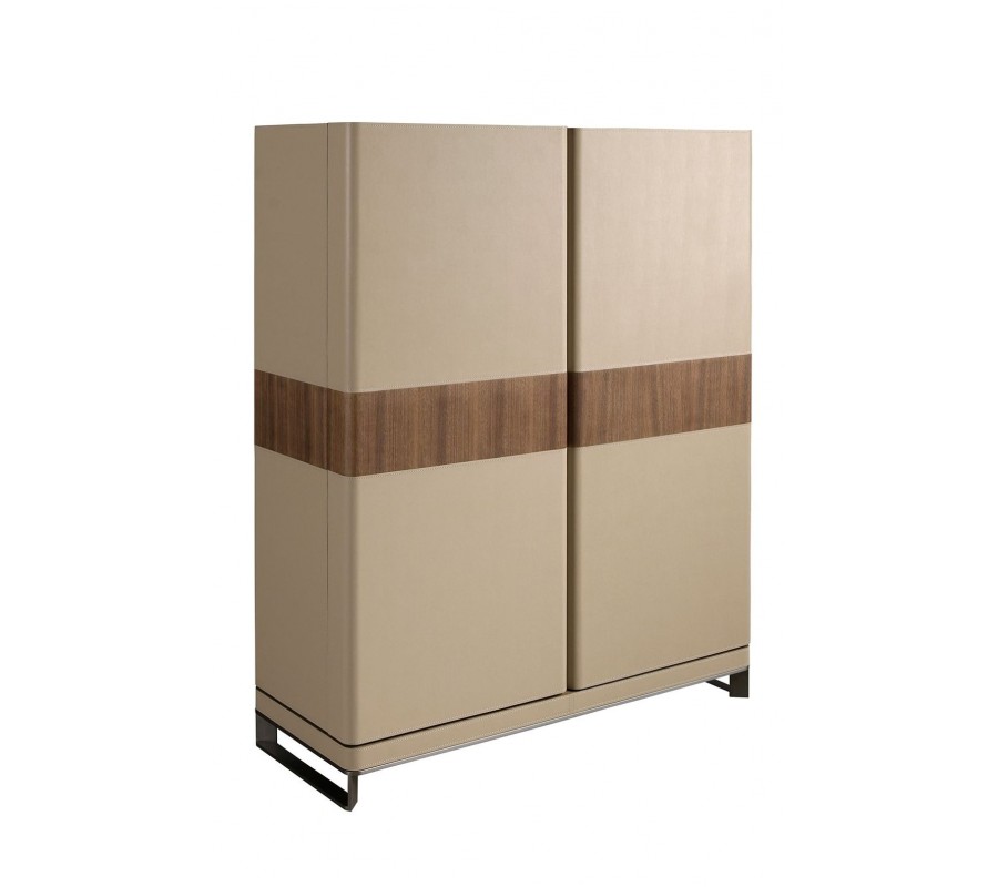 Luxusní moderní barová skříňka Vita Naturale je výjimečný kus nábytku s elegantním designem, který kombinuje kvalitní materiály a funkční detaily. Konstrukce je vyrobena z přírodní ořechové dýhy a celý povrch je potažen hovězí kůží v norkové hnědé barvě, která jí dodává sofistikovaný vzhled. Dvířka jsou zvýrazněna dekorativnímdřevěným pásem, který vytváří kontrast a umocňuje exkluzivní charakter skříňky. Stabilitu zajišťují leštěné ocelové nohy, které působí moderně a zároveň udržují konstrukci pevnou. Tento elegantní kus reprezentuje moderní italský design, známý svojí propracovanou estetikou a luxusním provedením.