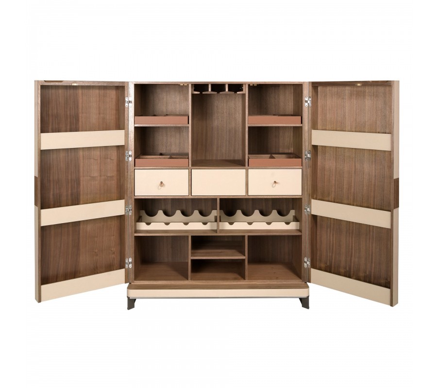 Barová skříňka má dvoudveřové otevírání s úchytkami a systémem jemného zavírání. Uvnitř se nachází bohatý úložný prostor s promyšleným uspořádáním. Nad třemi centrálními zásuvkami jsou po bocích čtyři police s úložnými přihrádkami a uprostřed vysoká police s držáky na sklenice. Pod zásuvkami se nacházejí dvě velké police s držáky na vínové láhve, které umožňují uložit je bezpečně a přehledně. Zcela dolů jsou dvě středové police nad sebou a po stranách dvě samostatné boční. Na dvířkách jsou umístěny tři úzké police, které poskytují další prostor pro uskladnění lahví.