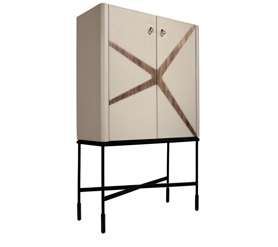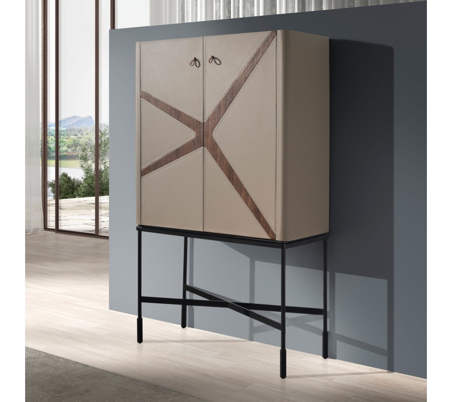 Luxusní moderní barová skříňka Forma Moderna s béžovým potahem z pravé kůže a hnědými dřevěnými detaily 150 cm