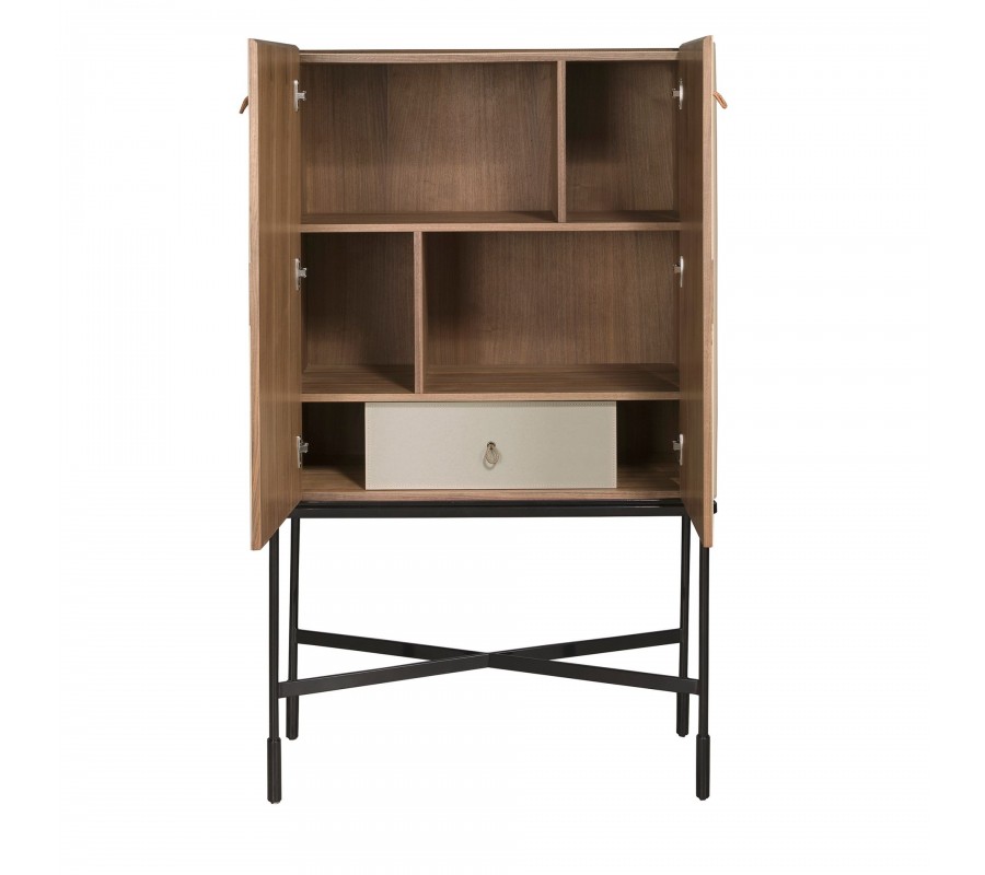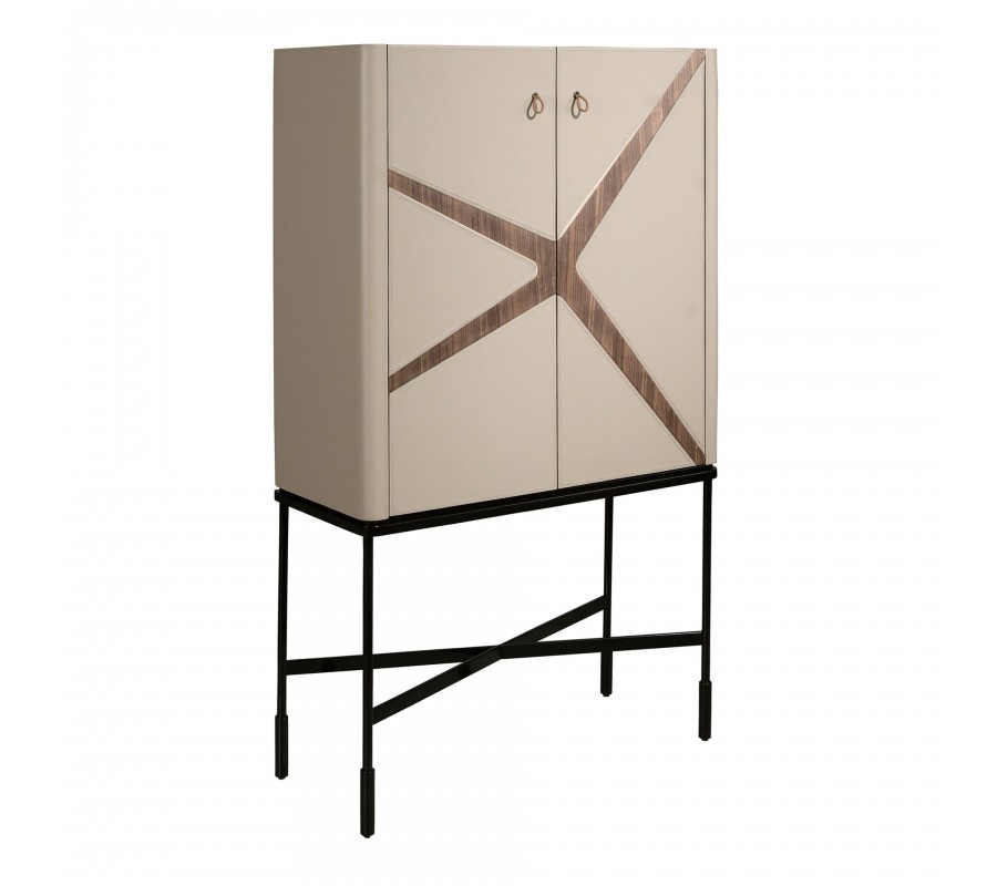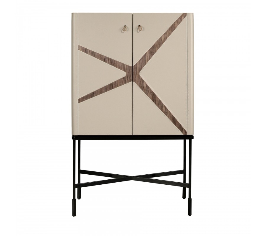 Tělo skříňky má obdélníkový půdorys a je vyrobeno z pravé ořechové dýhy s naturální teplé hnědé barvě. Jemná kresba letokruhů vytváří subtilní vizuální strukturu a zároveň přináší do kompozice přírodní teplo. Boční strany jsou pokryty potahem z pravé kůže v norkové béžové barvě. Na dvířkách je v potahu výřez ve tvaru asymetrického X, který odhaluje dřevo pod potahem. Toto zdobení působí moderním dojmem a dodá prostoru minimalistický dekorativní prvek.