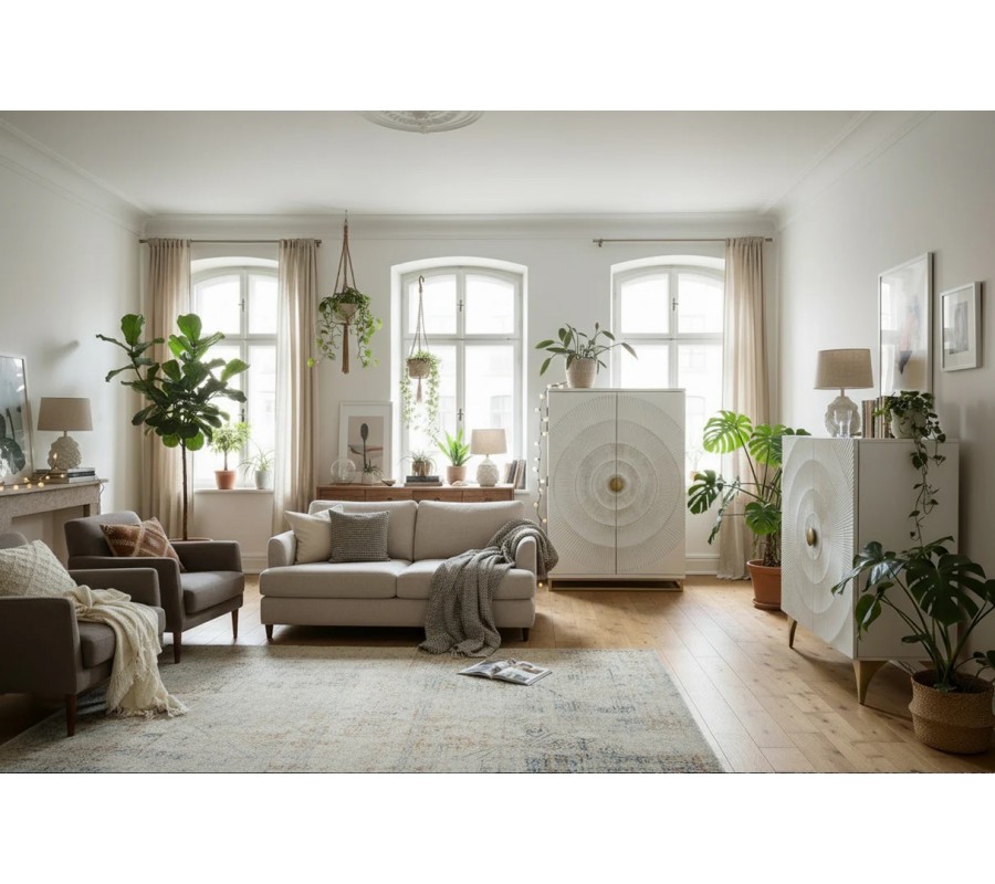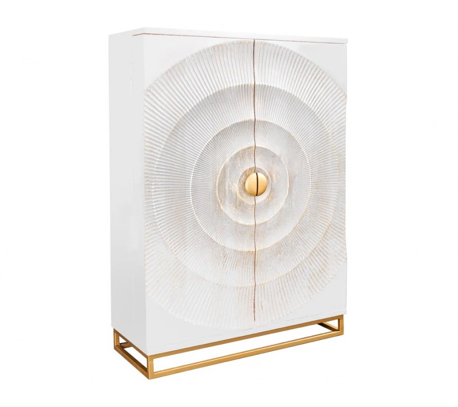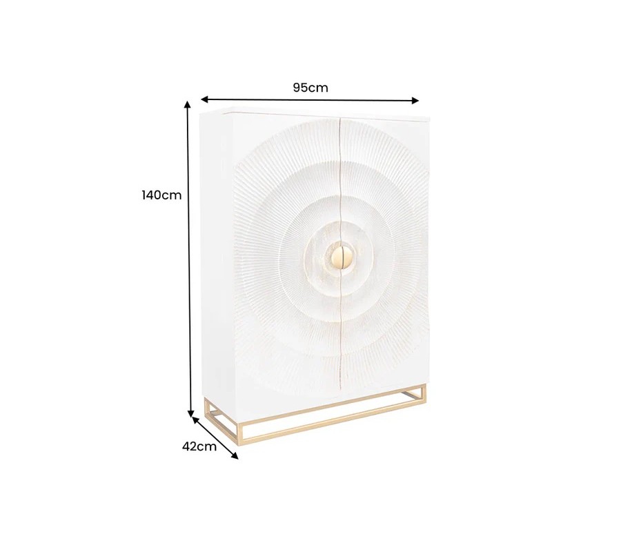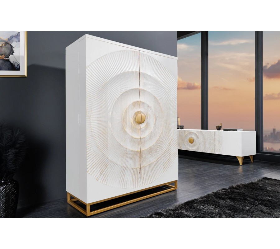 Luxusní orientální dvoudveřová barová skříňka Cumbria je výrazný designový solitér, který v interiéru okamžitě upoutá pozornost a dodá mu exkluzivní charakter. Skříň je vyrobena z masivního mangového dřeva v elegantní bílé barvě, doplněné o zlaté detaily, které podtrhují její luxusní a dekorativní vzhled. Dominantním prvkem jsou dvoje dveře s bohatým reliéfním zdobením – nacházejí se na nich čtyři kružnicové vyřezávané motivy se zlatou patinou, které působí plasticky a umělecky. Ve středu dveří jsou umístěny půlkruhové zlaté kovové celistvý kruh a dotváří symetrický design skříně. Interiér je v hnědé přírodní barvě.