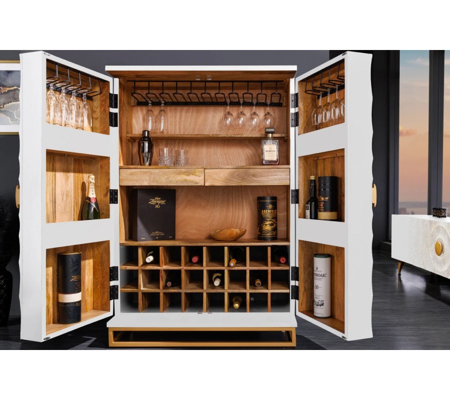 Luxusní orientální dvoudveřová bílá barová skříňka Cumbria z masivního dřeva se zlatými detaily a kovovou konstrukcí 140 cm