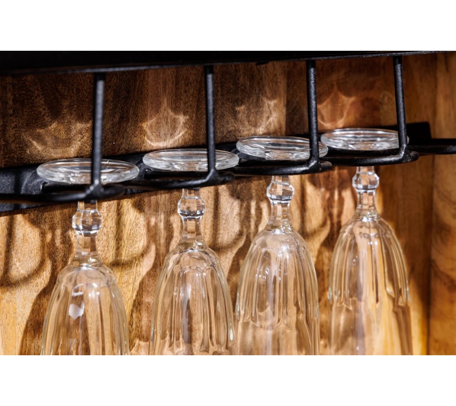 Skříňka stojí na kovové obdélníkové konstrukci ve zlaté barvě, která jí dodává vizuální lehkost, stabilitu a moderní akcent. Interiér je promyšleně členěný a navržen speciálně pro barové využití. Uvnitř se nachází 18 kovových černých držáků na sklenice – čtyři jsou umístěny po stranách v horních částech dveří a deset v horní části uprostřed. Pod držáky ve dveřích se nacházejí dvě úzké police nad sebou určené na láhve. Ve střední části skříně jsou dvě zásuvky, pod kterými se nachází jedna police, a ve spodní části jsou klasické čtvercové přihrádky na víno s kapacitou 24 lahví.