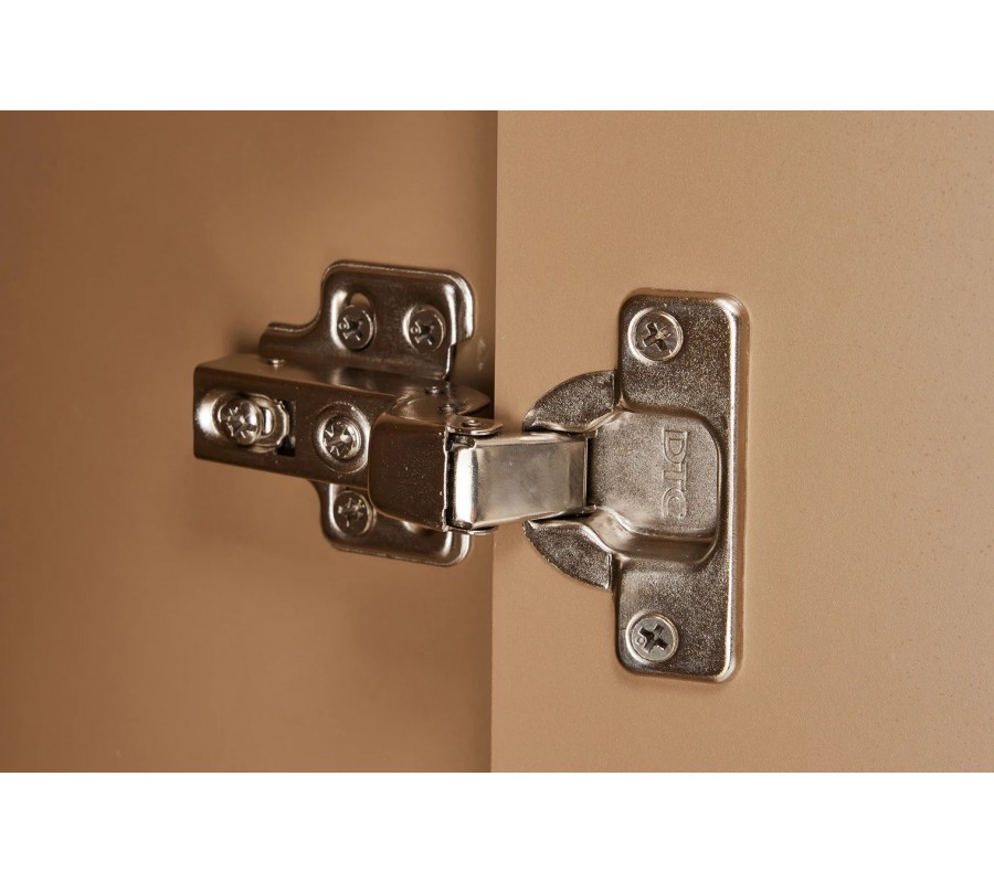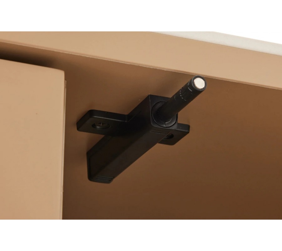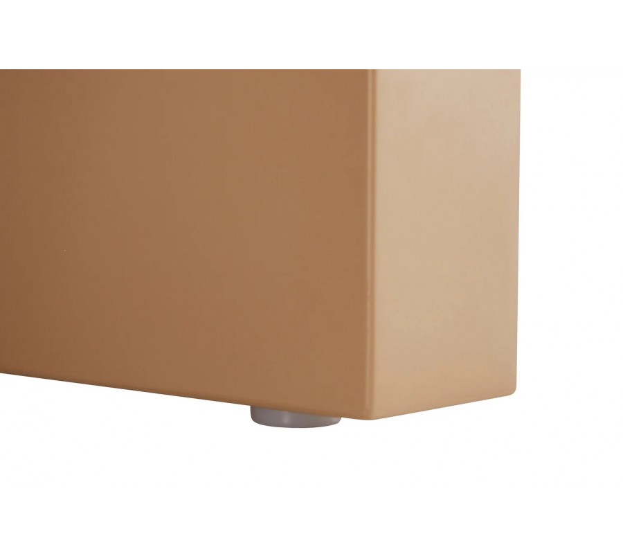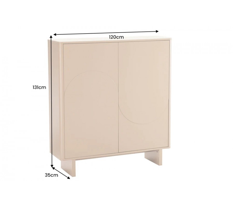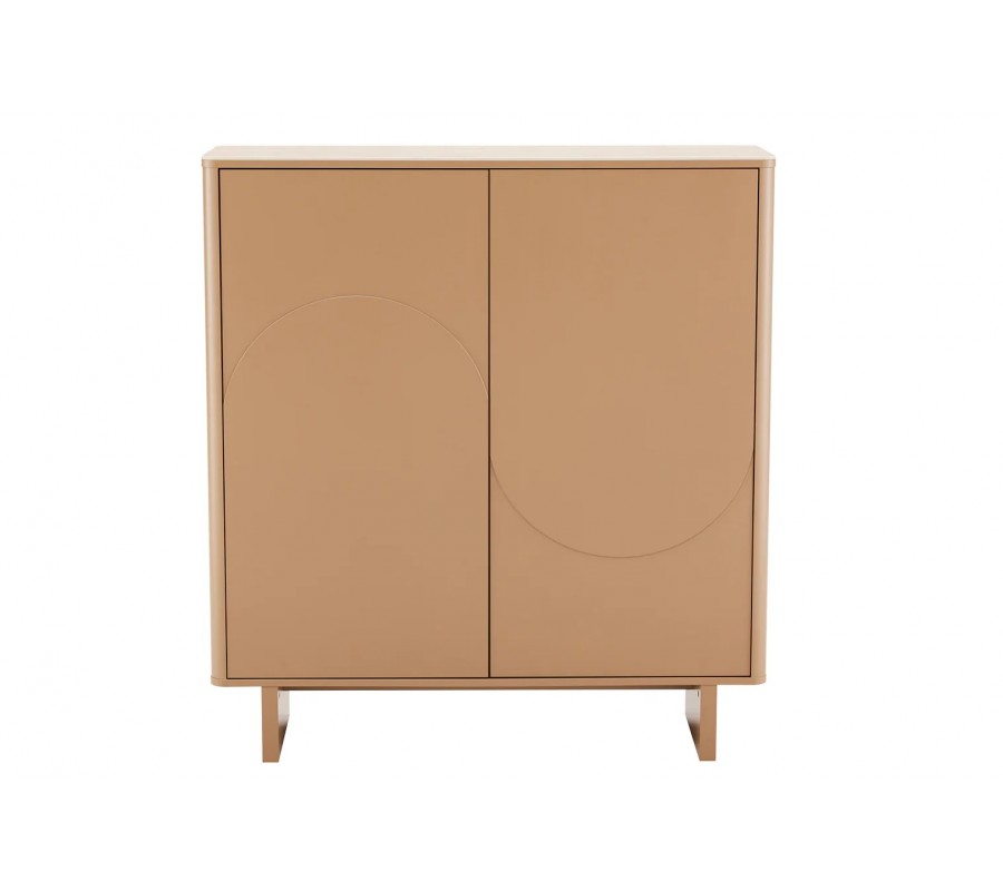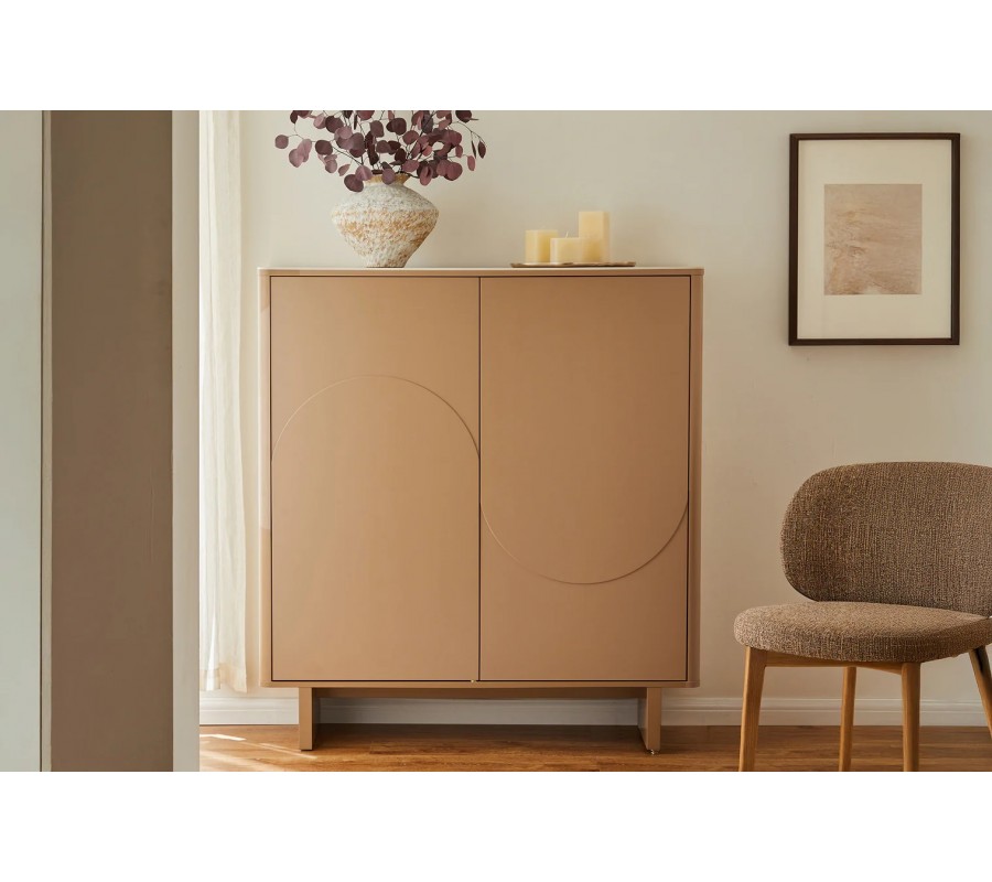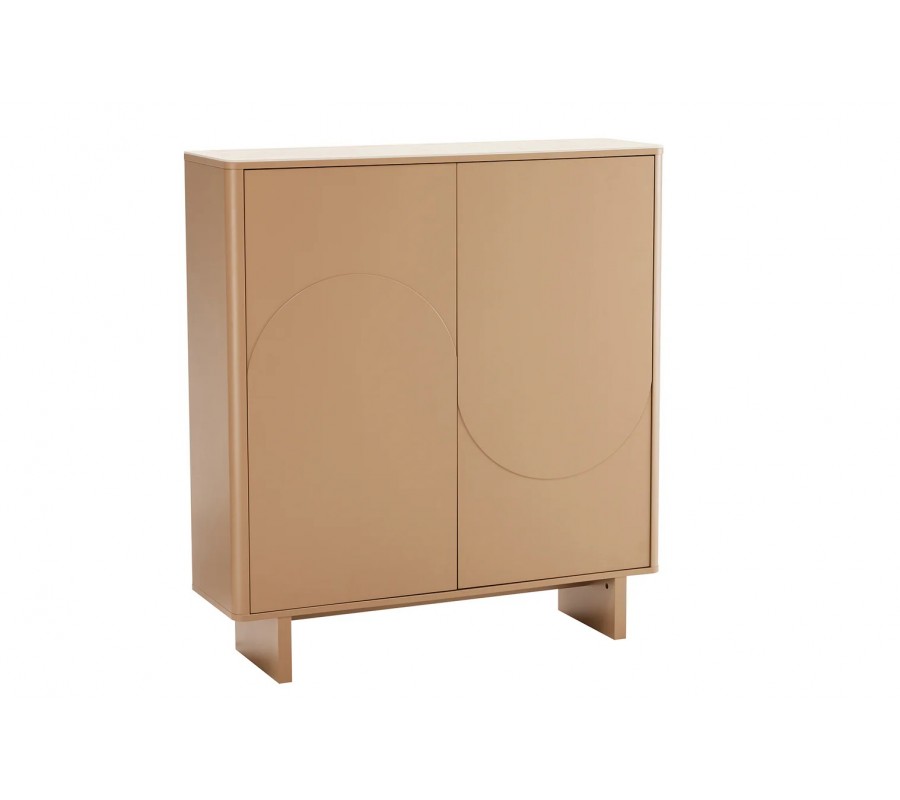 Skříňka je vyrobena z dýhovaného dřeva s teplým světle hnědým lakováním. Výborně jej doplňuje vrchní deska z keramiky s designem přírodního travertinu v béžových odstínech, která také zaručuje pevný, odolný a pro údržbu nenáročný povrch. Dvířka zdobí geometrický reliéf ze dvou půloblouků, které se pojí do designu vlny. Tvar je výrazný a typický pro art deco styl, ale provedení ze snížených a zvýšených ploch působí moderním minimalistickým dojmem.