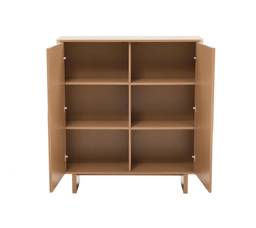 Barová skříňka Savonia bude elegantním doplňkem vaší jídelny, který spojuje moderní minimalismus s estetikou art deco stylu. Provedení v příjemné hnědé barvě působí sofistikovaně a potěší vás i bohatý úložný prostor.