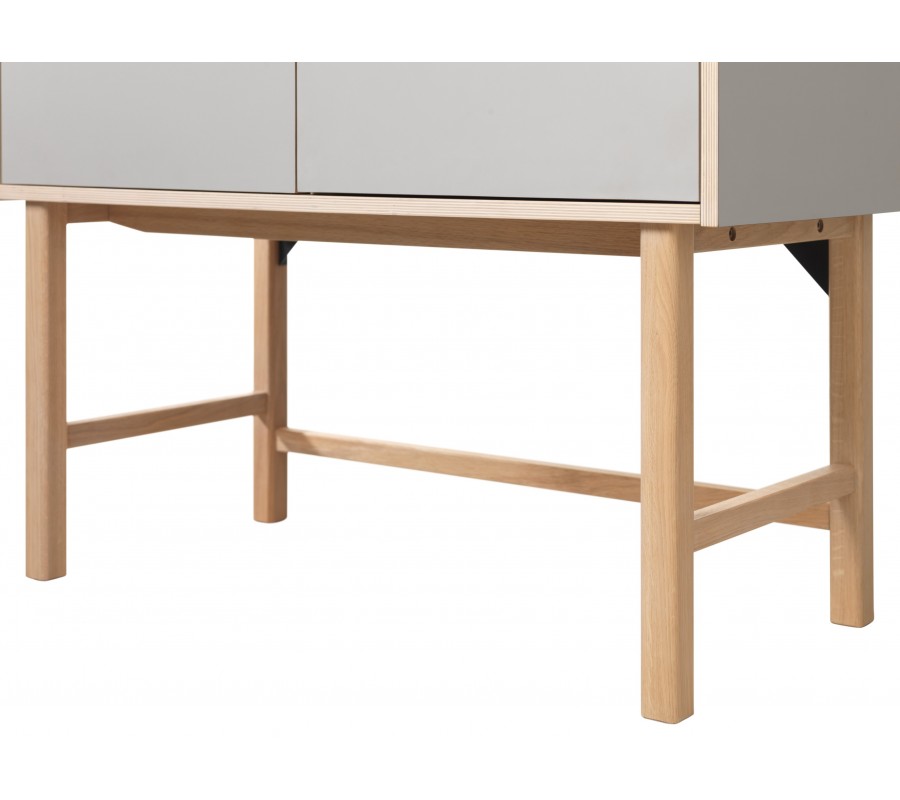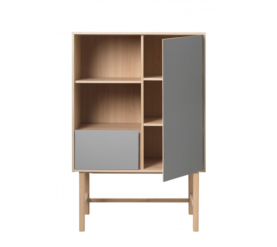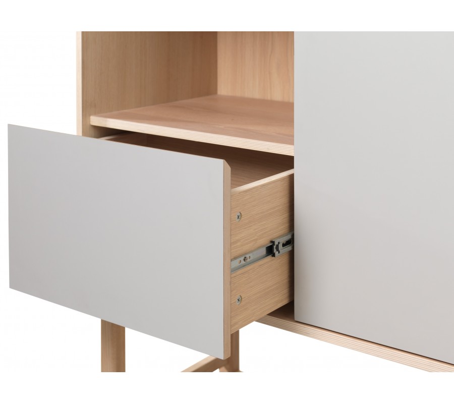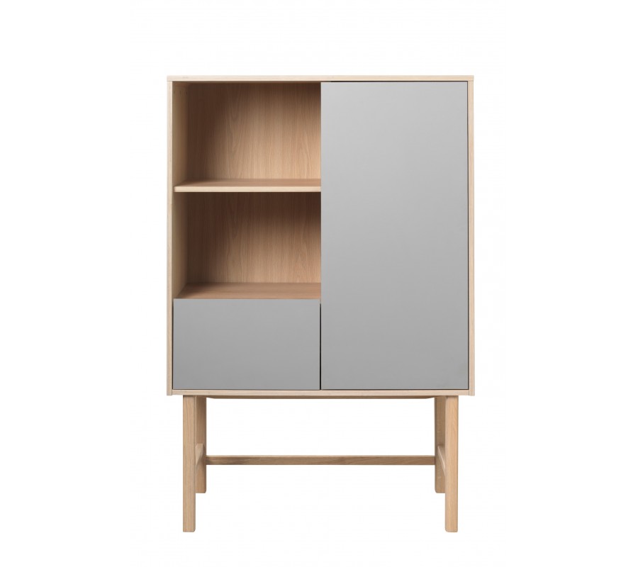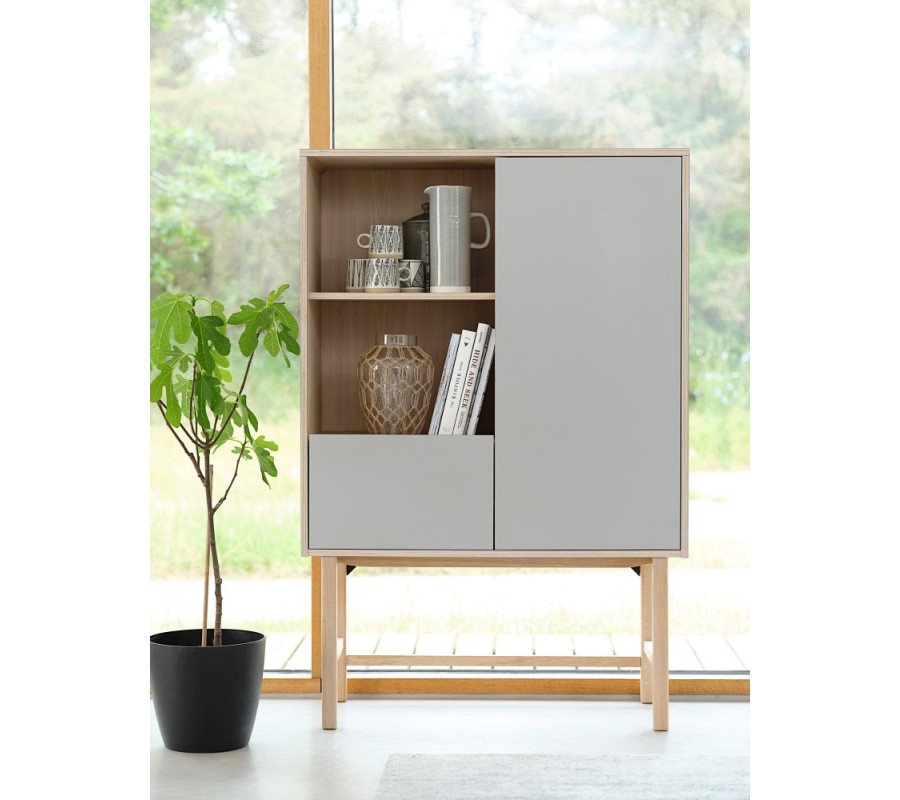 Skříňka má asymetricky řešený úložný prostor – na pravé straně se nacházejí dvířka se šedým čelem, za kterými je krytý úložný prostor. Nalevé straně je otevřená část se dvěma policemi, vhodná pro vystavení lahví, sklenic nebo dekorací, a ve spodní části je umístěna praktická zásuvka. Vnitřek v dřevěném dekoru působí teplo a přirozeně. Celek doplňují štíhlé nožičky z masivního dřeva, které nábytek opticky odlehčují a dodávají mu typický skandinávský charakter.
