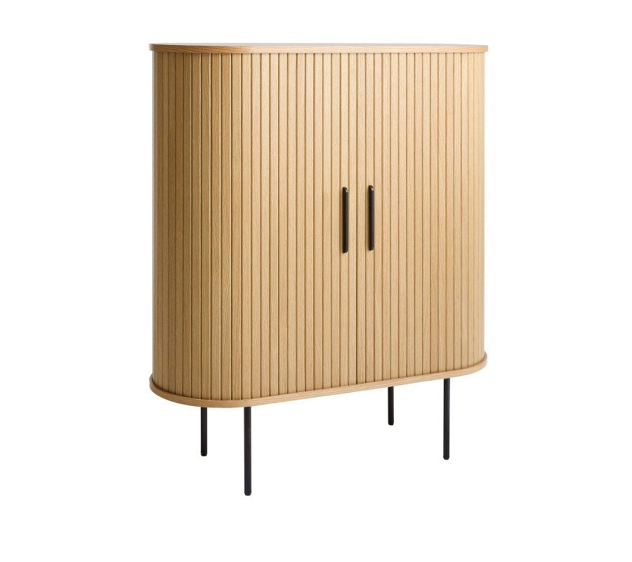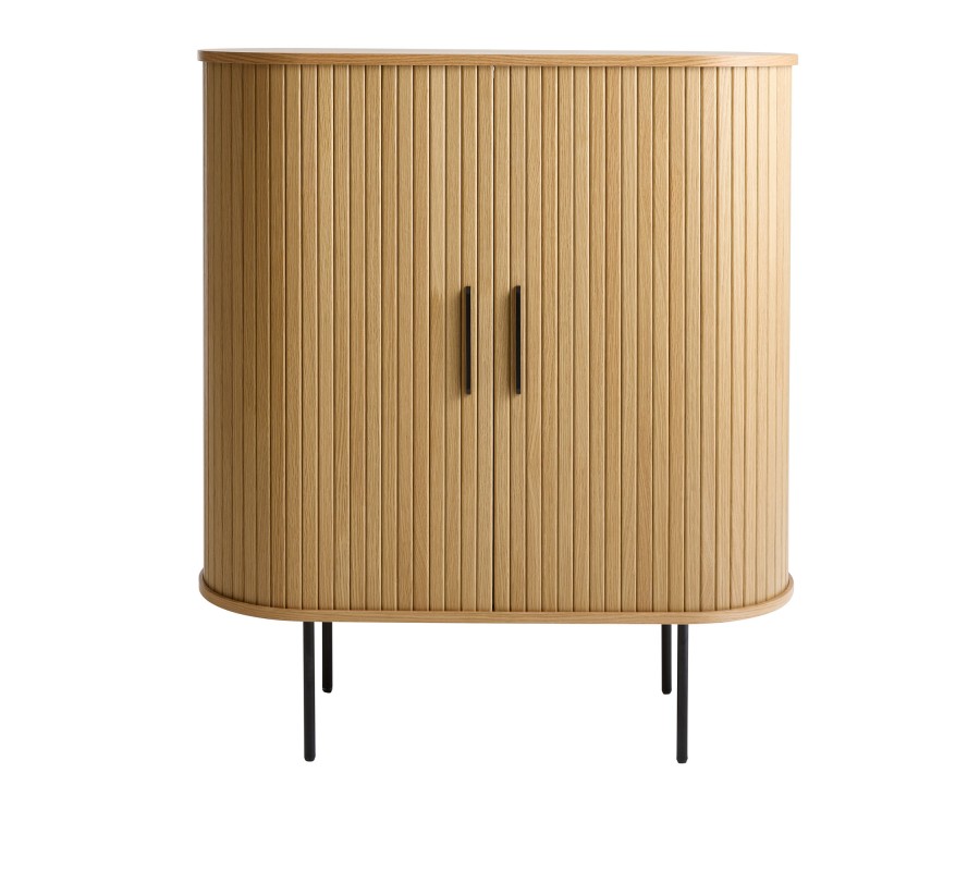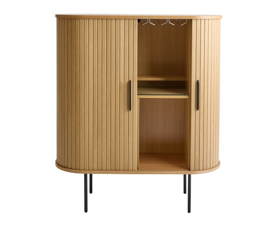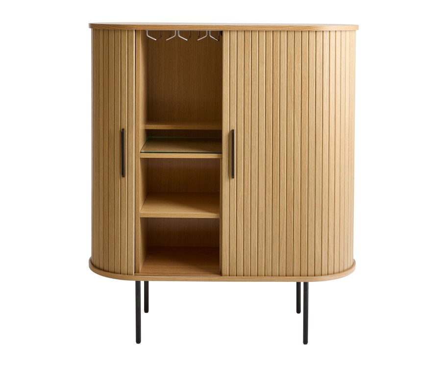Skandinávská světlá hnědá dubová barová skříňka Bornholm oválného tvaru s posuvnými dvířky a černými kovovými nohami 118 cm