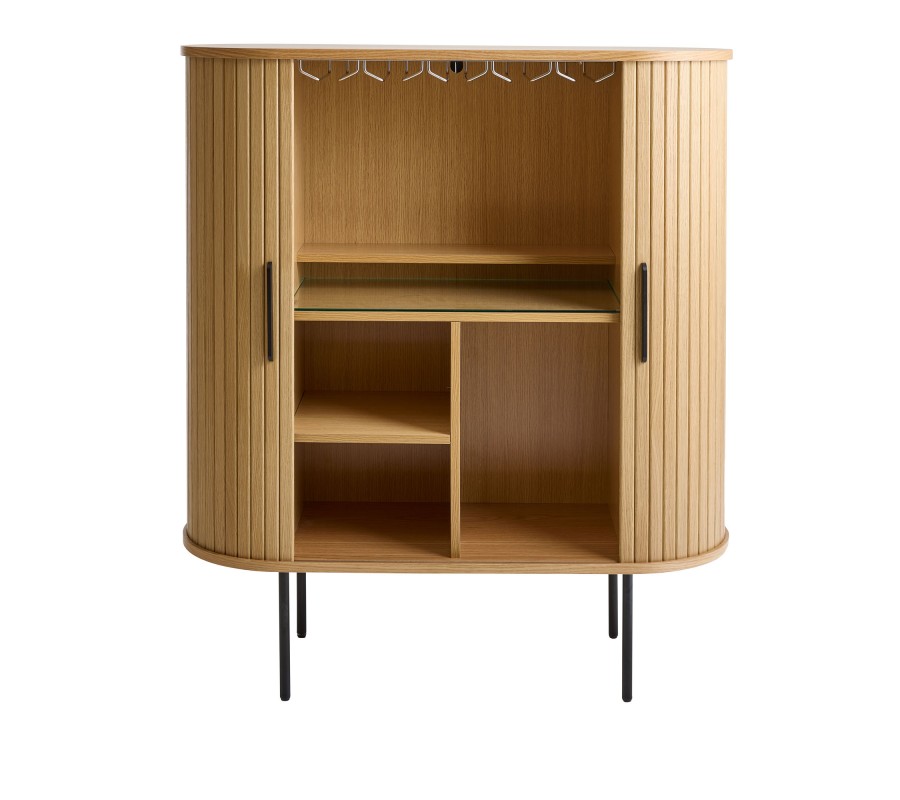 Interiér skříňky je přizpůsoben pro přehledné uložení lahví, sklenic i barového příslušenství. Spodní část je rozdělena vertikální příčkou – pravá strana poskytuje vyšší úložný prostor, zatímco levá je členěna na dvě police s poloviční výškou. Horní část této sekce pokrývá odolné bezpečnostní sklo, které se snadno udržuje a zároveň slouží jako praktická plocha pro přípravu nápojů. Nad ní se nachází užší dřevěná police a zcela nahoře konstrukce na zavěšení sklenic na stopce.