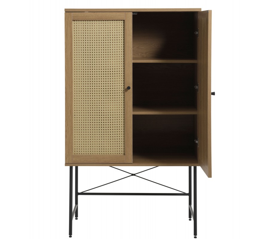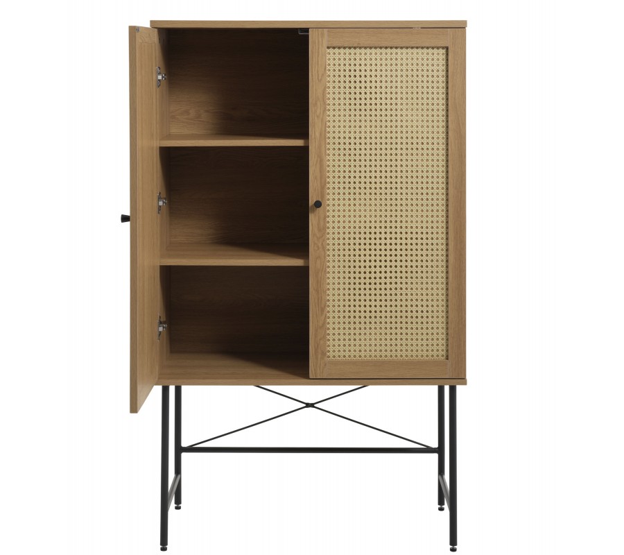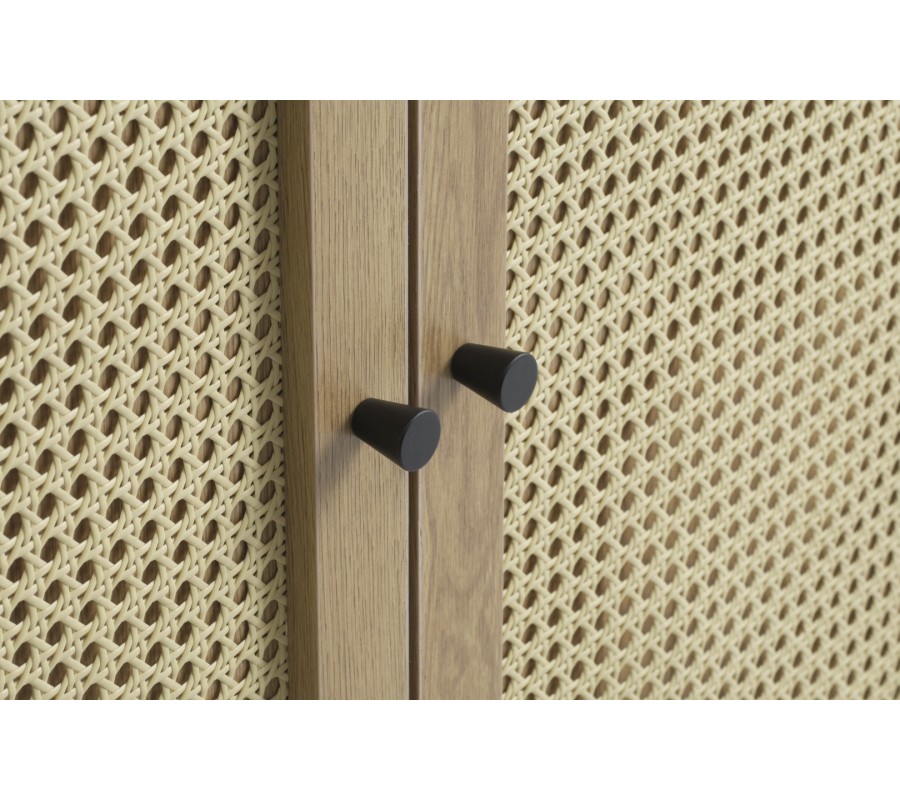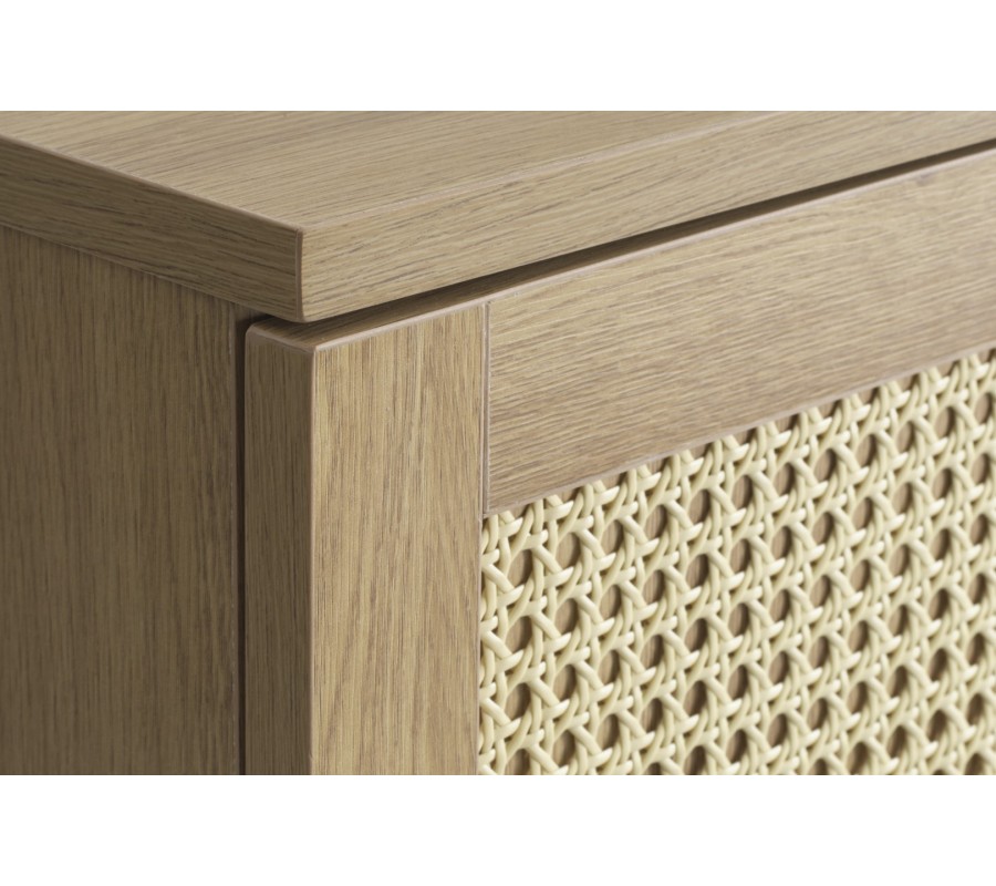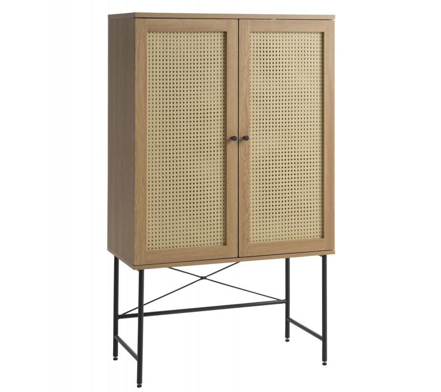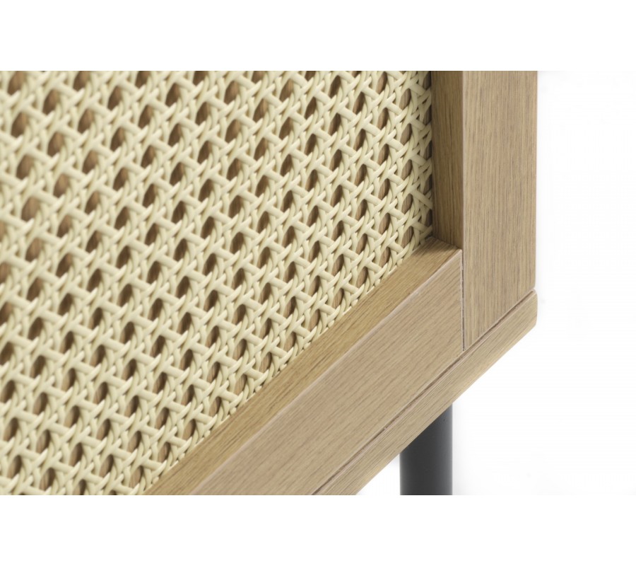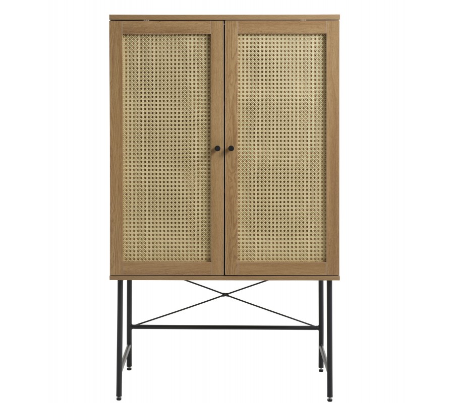 Skříňka má moderní lineární siluetu s obdélníkovým půdorysem. Korpus je vyroben z kvalitní MDF dýhy ve světle hnědé barvě. Jemná pravidelná kresba letokruhů jí dodává přírodní dubový vzhled, který výborně doplňuje světlý béžový ratanový výplet na dvojitých dvířkách. Vídeňský vzor výpletu tvoří elegantní retro akcent. Interiér je rozdělen na tři policové úrovně a poskytuje tak dostatek prostoru pro barové náčiní, láhve, nebo i větší nádobí či textilie.