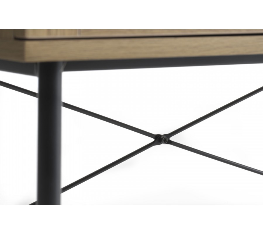 Dvířka jsou doplněna minimalistickými kulatými úchyty, ve stejném černém kovovém provedení jako podstava. Tu tvoří čtyři válcovité nožičky, které jsou na bočních a zadní straně zpevněny lineární výztuhou. Zadní je umístěna o něco výše nad ní se nachází konstrukční prvek ve tvaru X. Design podstavy dodává skříňce industriální nádech a její štíhlé linie vizuálně odlehčují mohutný úložný prostor.