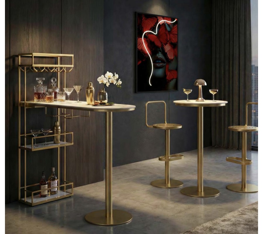 Barový stůl působí kompaktně a multifunkčně. Konstrukce je vyrobena z kovu v metalickém zlatém provedení. Lesklý povrch odráží světlo a v kombinaci se štíhlými liniemi dodává nábytku vzdušný a odlehčený vizuál. S kovem krásně koresponduje deska z bílého mramoru, podtrhující luxusní glamour charakter. Zároveň poskytuje pevný, odolný a pro údržbu nenáročný povrch.