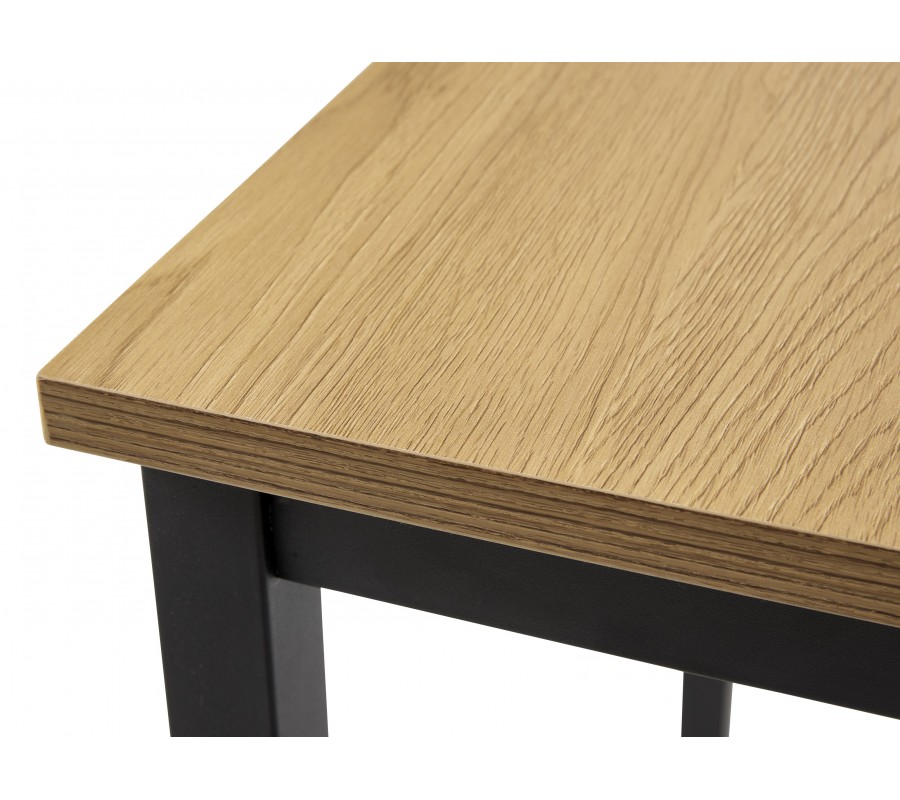 Vrchní deska má čtvercový tvar a je vyrobena z dýhy ve světlém hnědém přírodním dekoru dubu. Povrch je ošetřen melaminovou vrstvou, která zvyšuje odolnost vůči poškrábání, teplu i vlhkosti. Jemná kresba dřeva působí přirozeně a vytváří teplý akcent ke kovovové konstrukci.