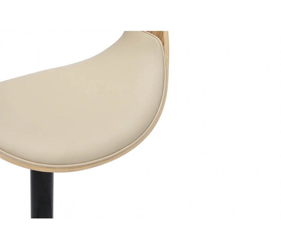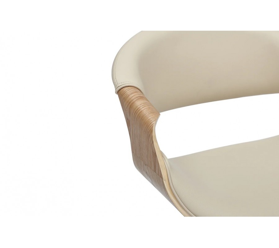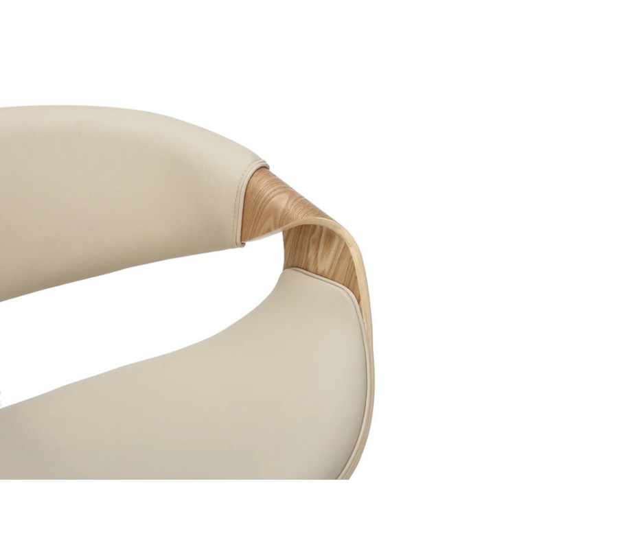 Na první pohled vás zaujme unikátně tvarované sedátko s konstrukcí z pravé dubové dýhy v přírodním světlém hnědém odstínu s tmavší kresbou letokruhů. Výrazně prohnutý rám sedáku je na stranách vytažen směrem nahoru, kde ve výrazném dynamickém ohybu plynule přechází do zádové opěrky. Ta je, stejně jako vrchní část sedáku, překryta čalouněním s potahem z ekokůže v krémovém béžovém odstínu. Tato kombinace dodává židli harmonický skandinávský vizuál.