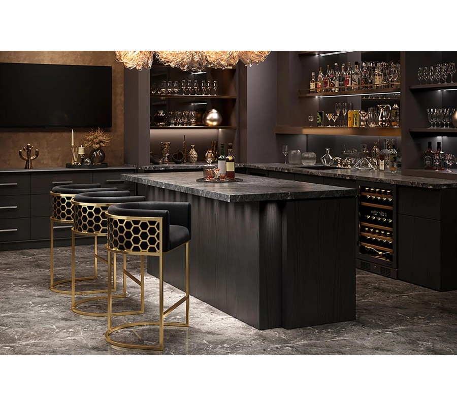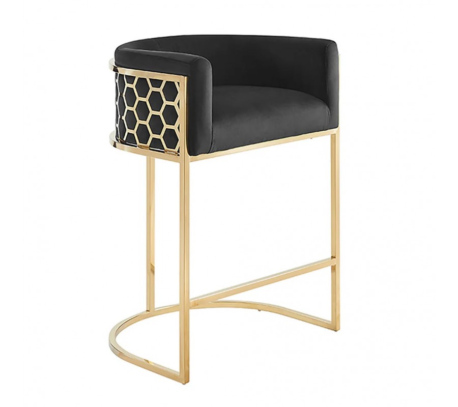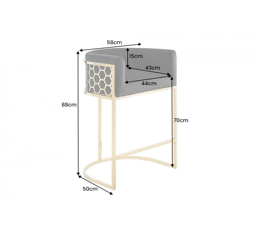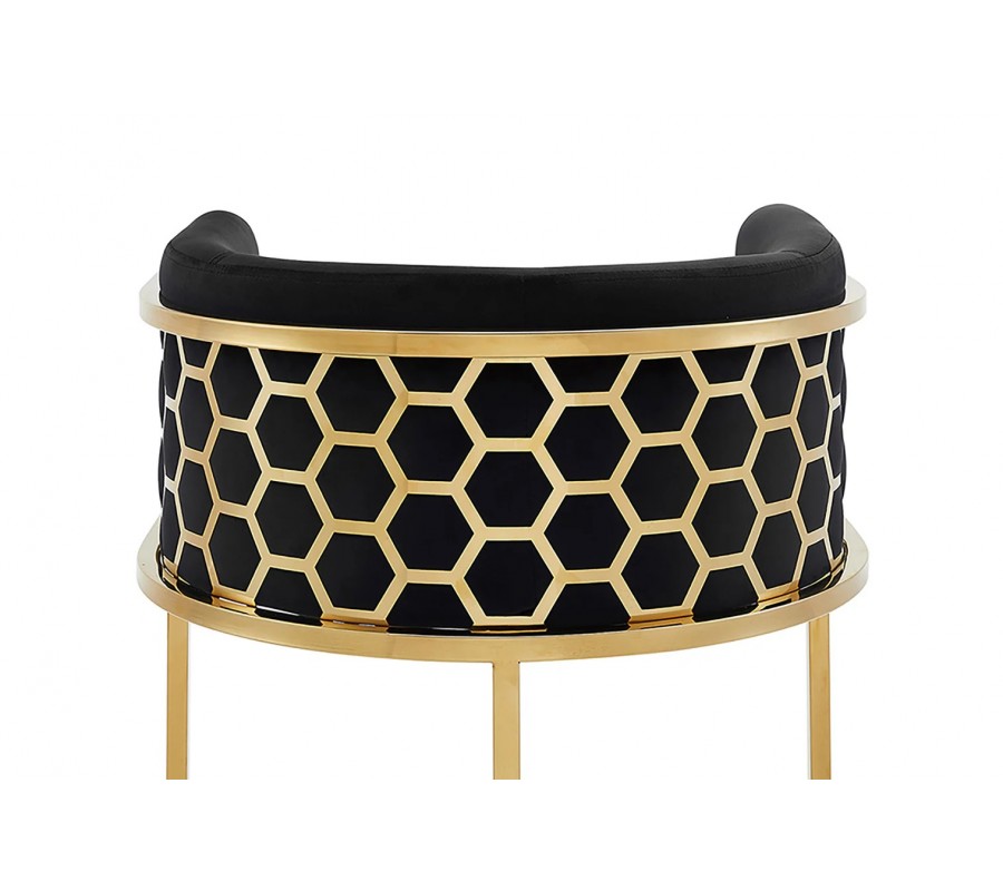 Art deco barová židle Aurelia Gold spojuje elegantní design, noblesu zlatých detailů a moderní komfort. Sedací část ve tvaru jemného „U“ je potažena hladkým černým sametem, který působí měkce a zároveň dodává celku exkluzivní vzhled. Židle stojí natenké, dlouhé a úzké kovové konstrukci ve zlatém provedení, jejíž spodní linie kopíruje oblý tvar sedáku, čímž vytváří harmonickou a velmi čistou siluetu. V přední části konstrukce se nachází praktická opěrka pro nohy pro pohodlné sezení. Charakteristickým prvkem je art deco dekor v podobě medového plastu – šestiúhelníkového vzoru, který zdobí boční zadní stranu a plynule přechází až pod nízké obloukové opěradlo. Tento detail přináší do prostoru výraz luxusu a estetické preciznosti.