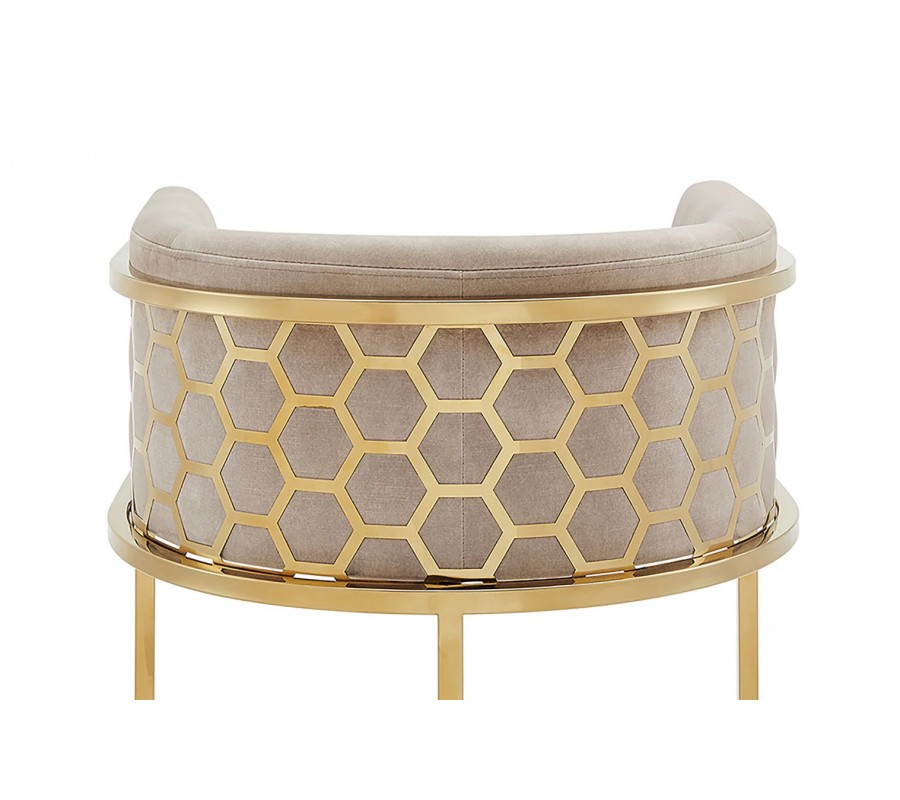 Zadní boční část přechází donízkého opěradla, kde vyniká výrazný medový šestiúhelníkový vzor – typický dekor pro art deco prvky. Kombinace teplé béžové a zlaté vytváří harmonický kontrast, který nepůsobí ostře, ale spíše jemně a stylově.