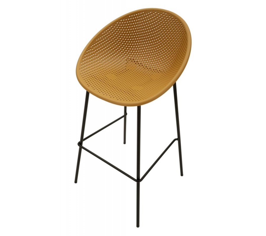 Moderní žlutá barová židle Isola s kompaktní kulatou sedací částí s perforovaným designem a černýma nohama 98 cm