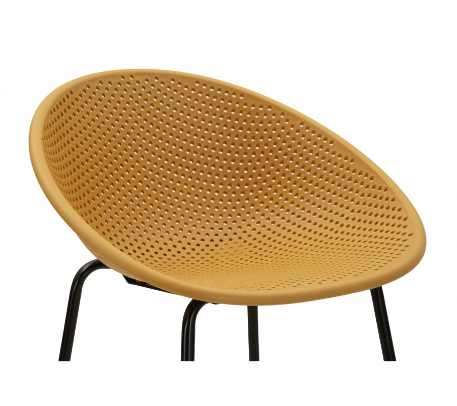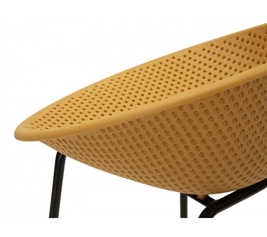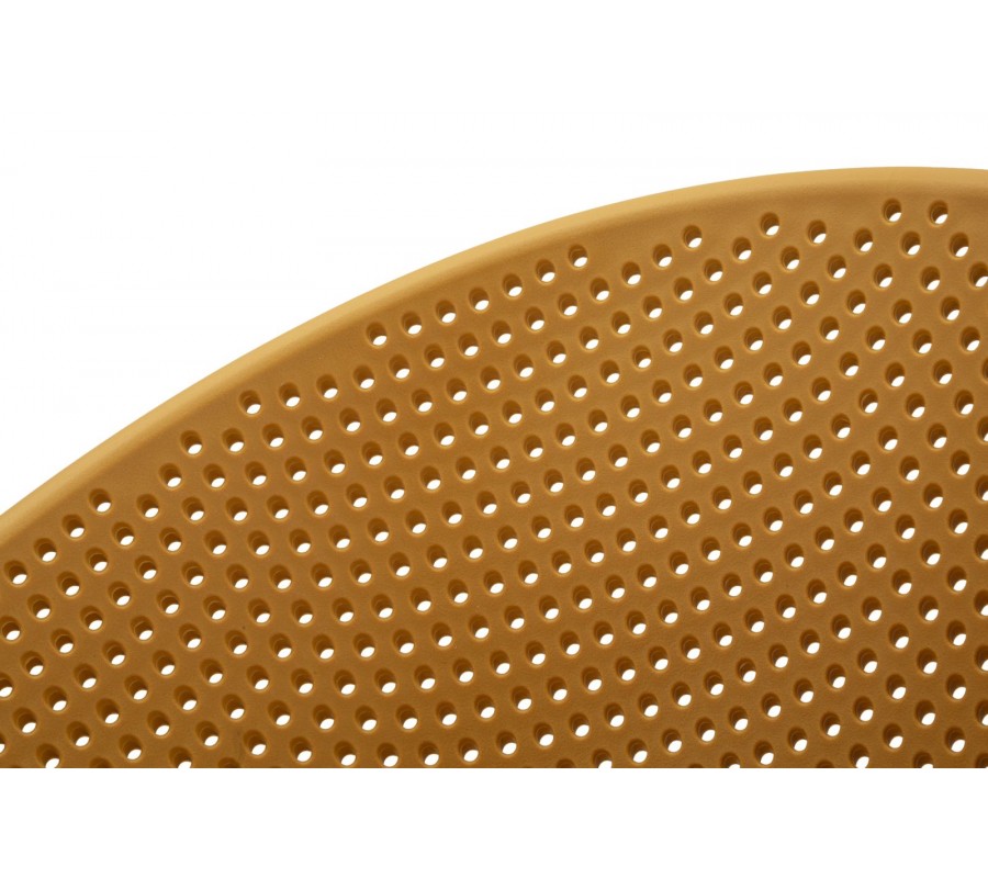Sedadlo je osazeno ve výšce 78 cm a doplňuje jej nízká opěrka zad, se kterou vytváří harmonický a kompaktní celek. Židle má moderní tvar s kulatým rámem a její povrch oživuje pravidelná perforace z drobných kruhových otvorů, která mu dodává zajímavou strukturu. Sedací část je zhotovena z odolného plastu, který se snadno udržuje a dobře odolává vlivům každodenního používání. Provedení v syté žluté barvě působí energicky a svěže.