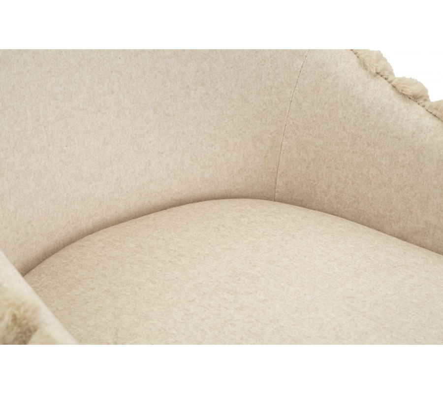 Pevná dřevěná konstrukce je pokryta pěnovou výplní a měkkým potahem, což zaručuje maximální komfort při sezení. Potah je vyroben z mikrovlákna, které mu zaručuje odolnost. Jeho plyšový finiš s delším vlasem připomíná kožešinu a je příjemný na dotek. Vnitřní strana sedací části je hladká, zatímco vnější obvod opěrky zdobí pravidelné vertikální prošívání.