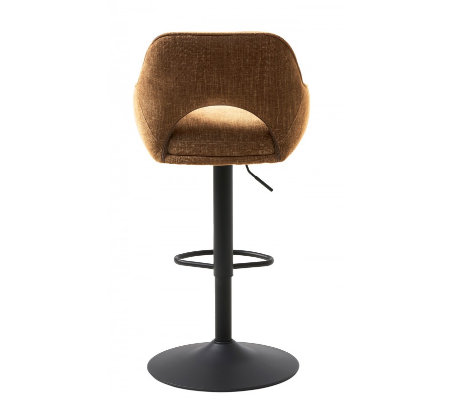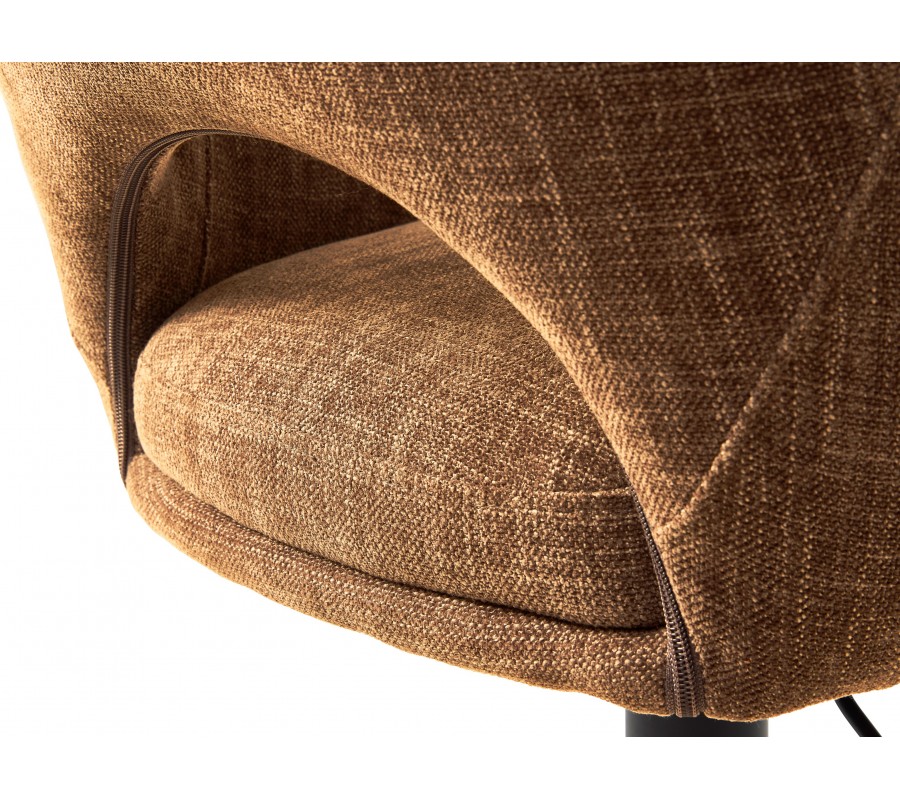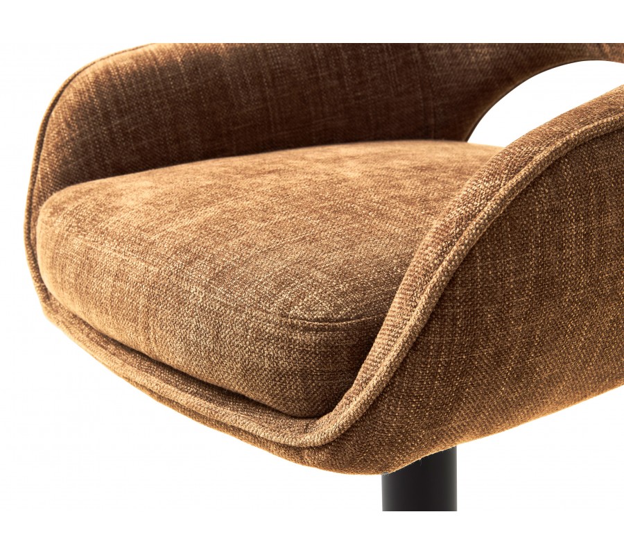 Barová židle má pohodlnou otočnou sedací část s pěnovým čalouněním, které jí dodává elegantní zaoblenou siluetu. Sedadlo má obdélníkový, v zadní části mírně zúžený tvar a je doplněno o vyšší polštář. Hranatá zádová a boční opěrky jsou propojeny v jednom celku s plynulými přechody, které působí harmonicky a výborně se přizpůsobí tělu. Zajímavým detailem je výřez půlobloukového tvaru mezi sedadlem a opěrkou, který design odlehčuje.