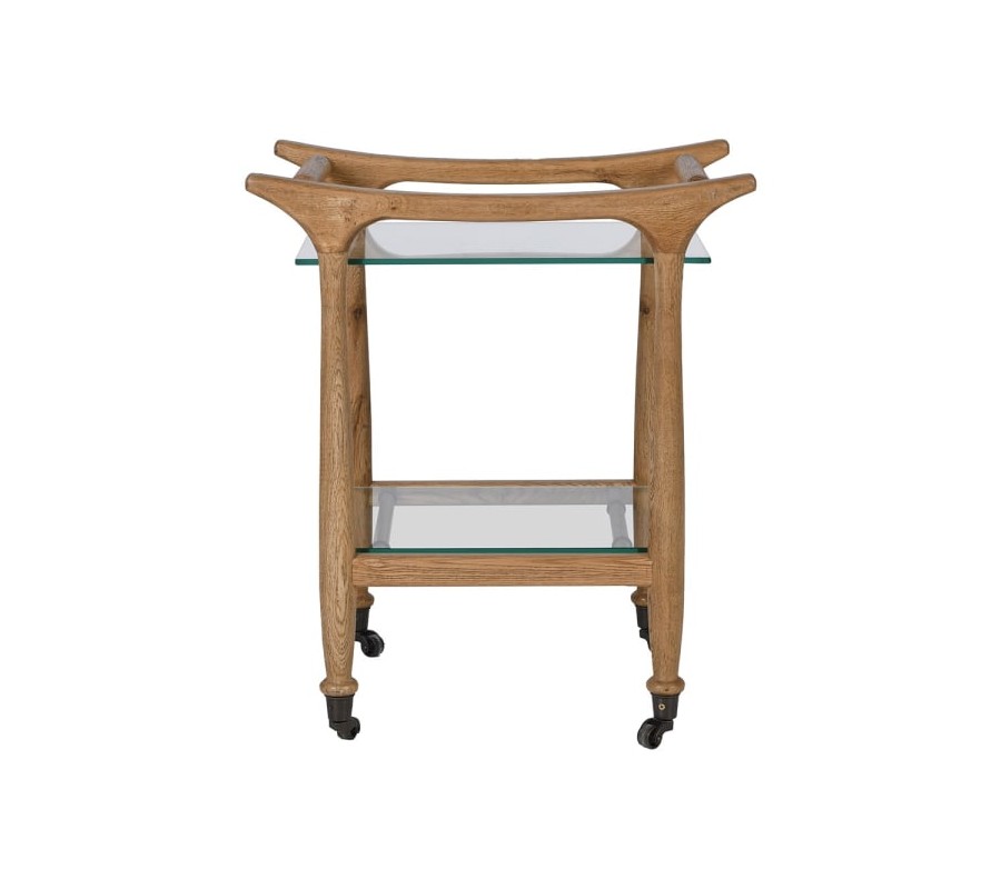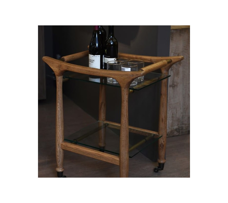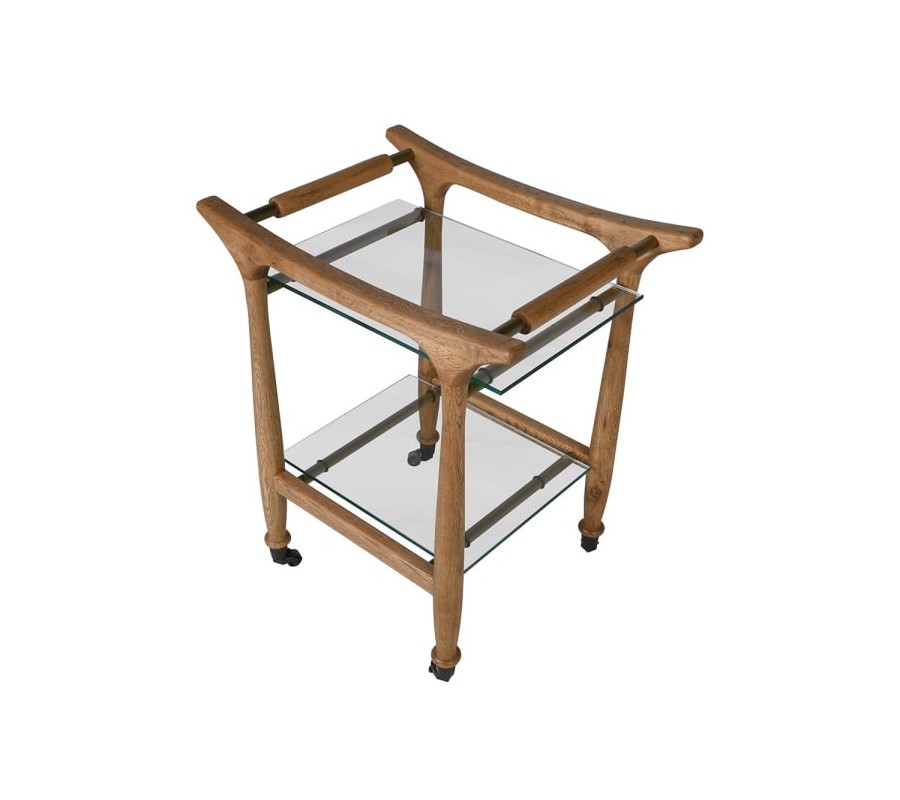 Designový servírovací vozík Arbor z masivního dubového hnědého dřeva se dvěma skleněnými policemi na kolečkách 70 cm