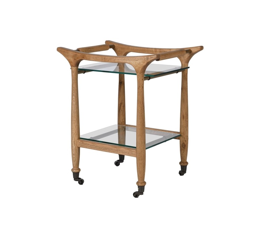 Praktičnost zajišťujíú dvě průhledné police z tvrzeného skla, které poskytují prostor pro odkládání nápojů, nádobí nebo dekorací. Celek stojí na černých kovových kolečkách, která umožňují snadné a flexibilní přesouvání v interiéru.