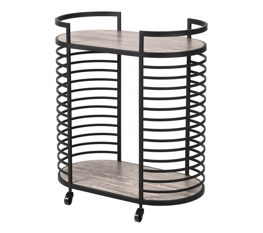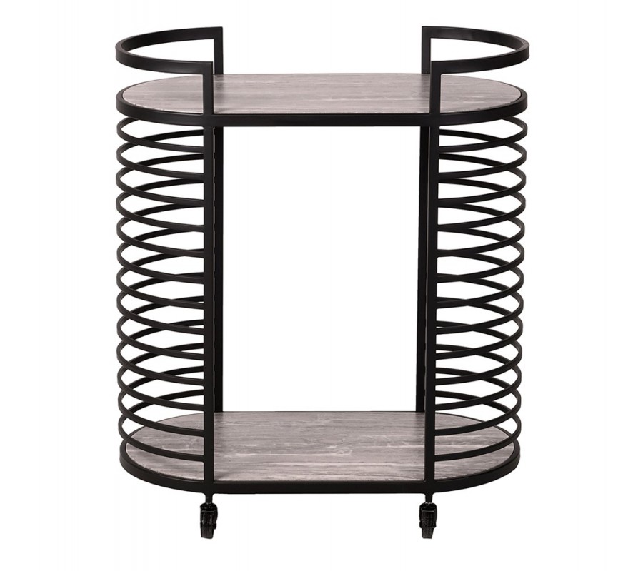 Vozík poskytuje štědrý odkládací prostor na dvou oválných policích. Jsou vyrobeny z dřevěné dýhy a zdobí je exkluzivní design mramoru s bohatou kresbou v odstínech hnědé a bílé, který dodává vozíku nádech luxusu.