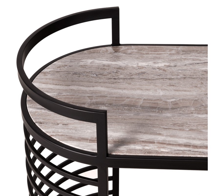 Moderní industriální oválný servírovací vozík Relos s černou kovovou konstrukcí a dvěma hnědými mramorovými policemi 76 cm