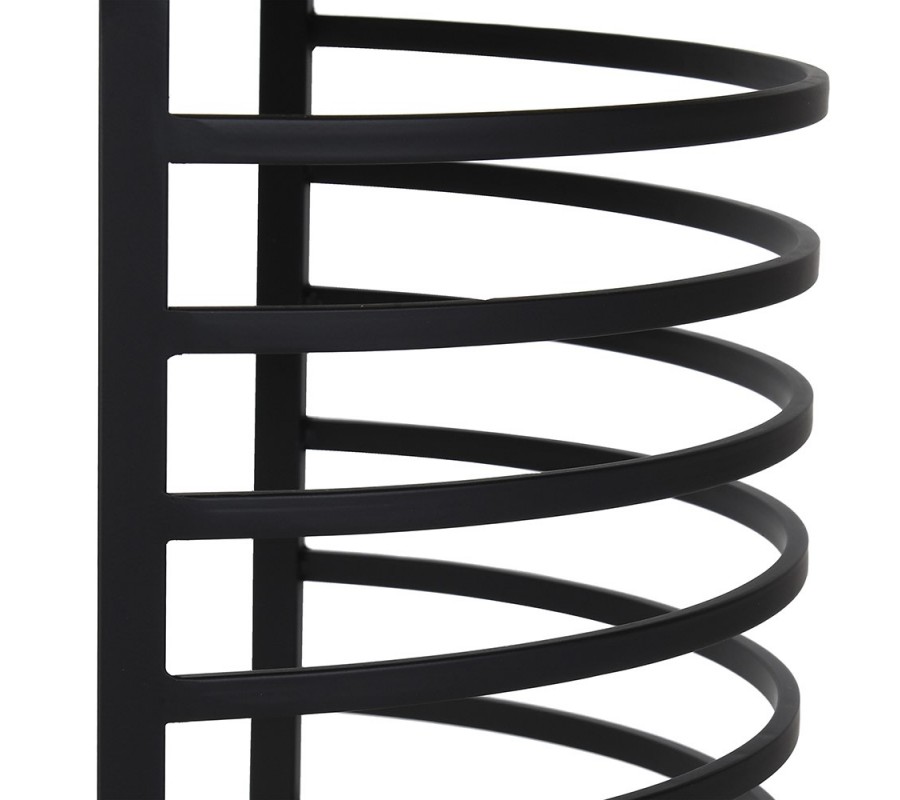 Konstrukce je vyrobena z kovu v matném černém provedení a její rovné geometrické linie působí moderním dojmem. Rámy desek jsou propojeny čtyřmi vysokými černými nožičkami. Ve spodní části jsou ukončeny kolečky a ve vrchní části se každé dvojice na straně spojuje v oblouku kopírujícím tvar desky. Stejné horizontální polobloukové prvky vyplňují obě strany konstrukce a vytvářejí tak stylový industriální vizuál.