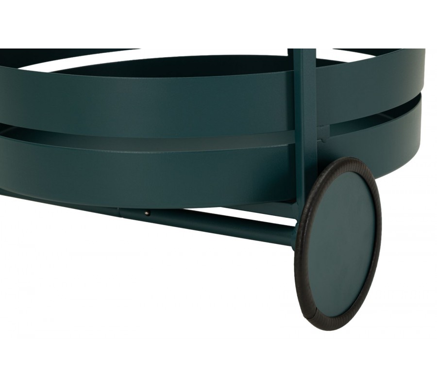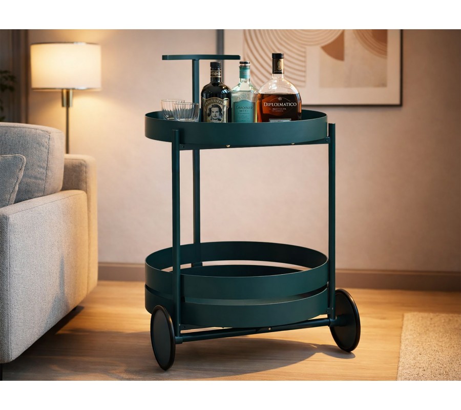 Stolek je vybaven dvěma kulatými úrovněmi – vrchní deskou a spodní policí, obě s jemně vyvýšenými tenkými hranami, které zabraňují sesunutí servírovaných předmětů a zároveň podtrhují. Spodní police poskytuje dostatek prostoru na láhve, sklenice nebo doplňky. Dvě kolečka umožňují snadné přesouvání stolku a pohodlnou manipulaci v prostoru.