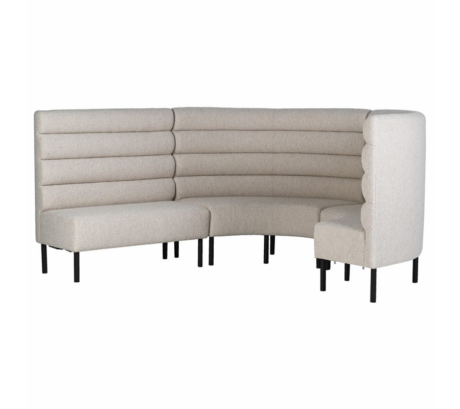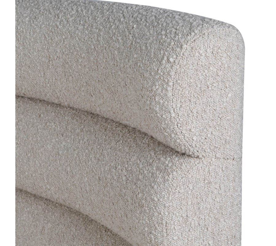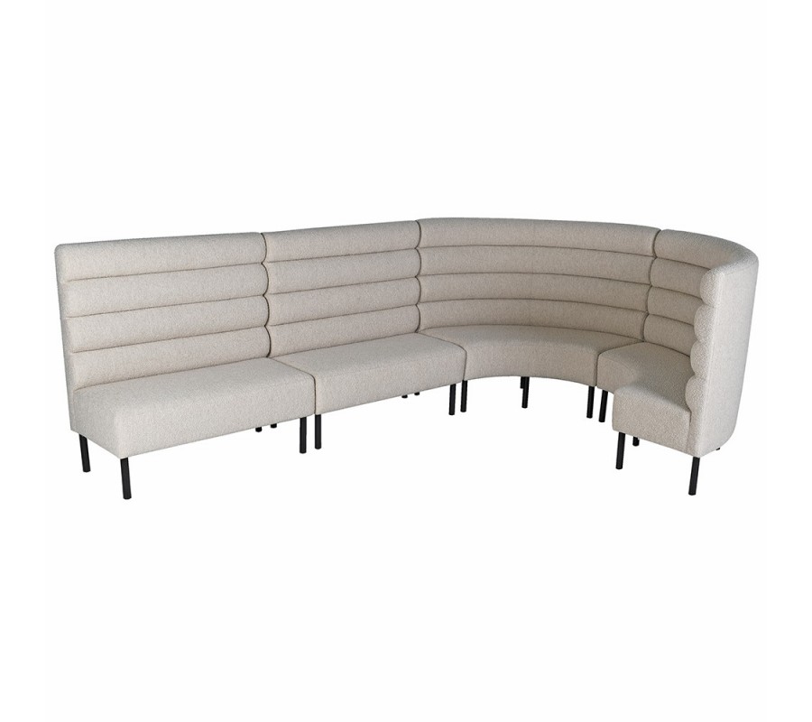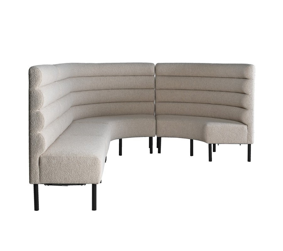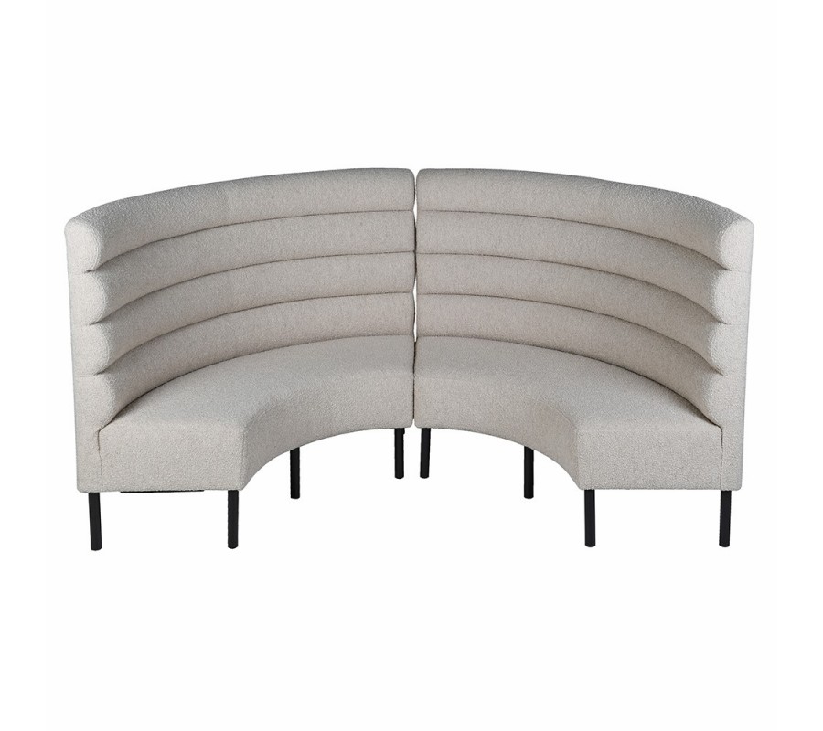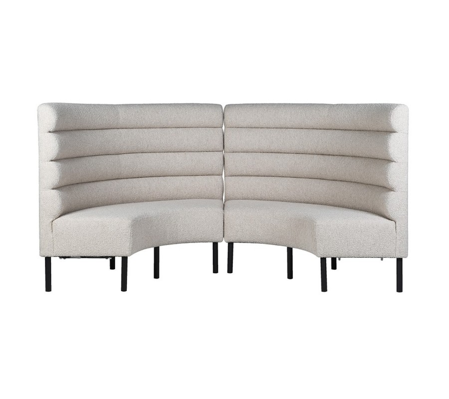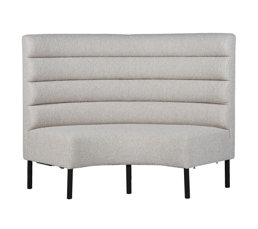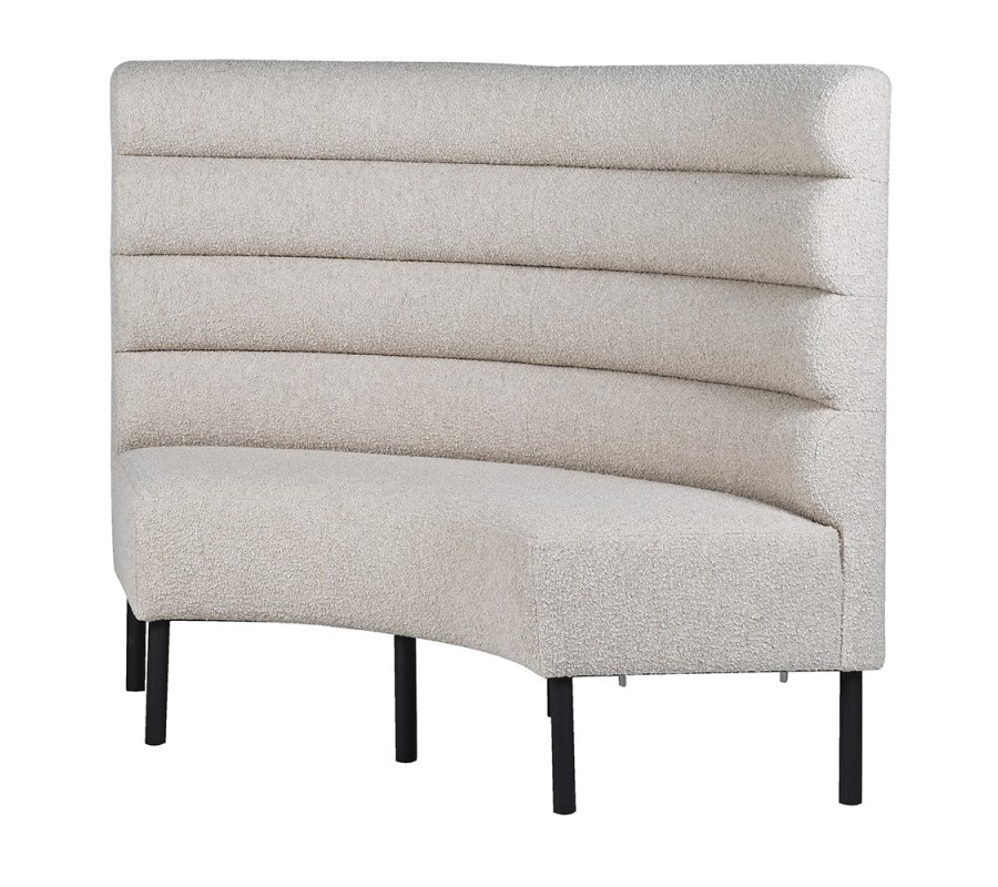 Vysoká zádová opěrkapolobloukový, zaoblený tvar, který dodává lavici jemnost a plynulost. Lavice je potažena béžovou textilií ve stylu buklé, horizontální čalounění vytváří plastický vizuální efekt a navazuje na aktuální trendy v interiérovém designu.