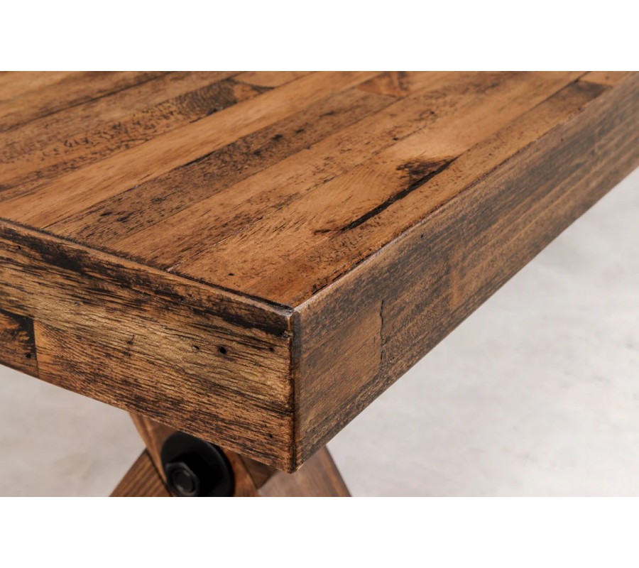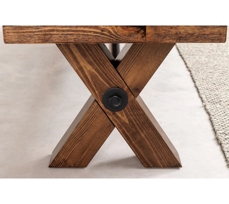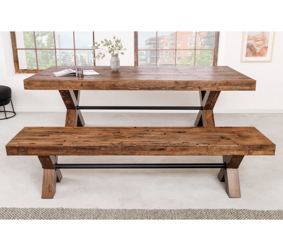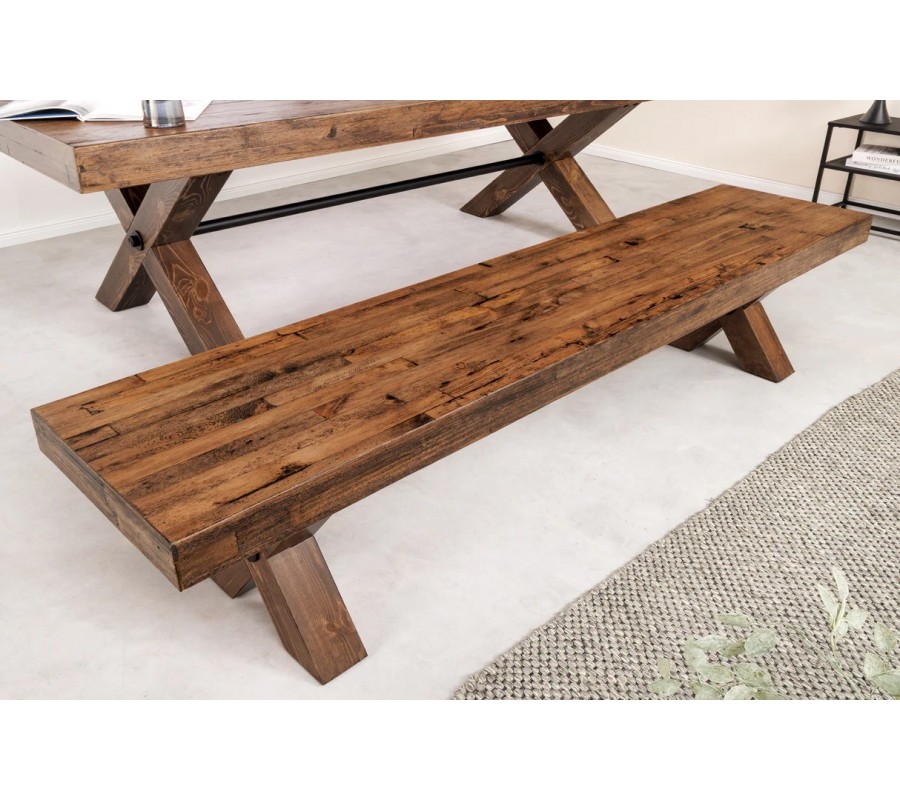 Venkovská masivní lavice Sawyer v hnědé barvě s tmavým patinovaným efektem a zkříženýma nohama 180 cm
