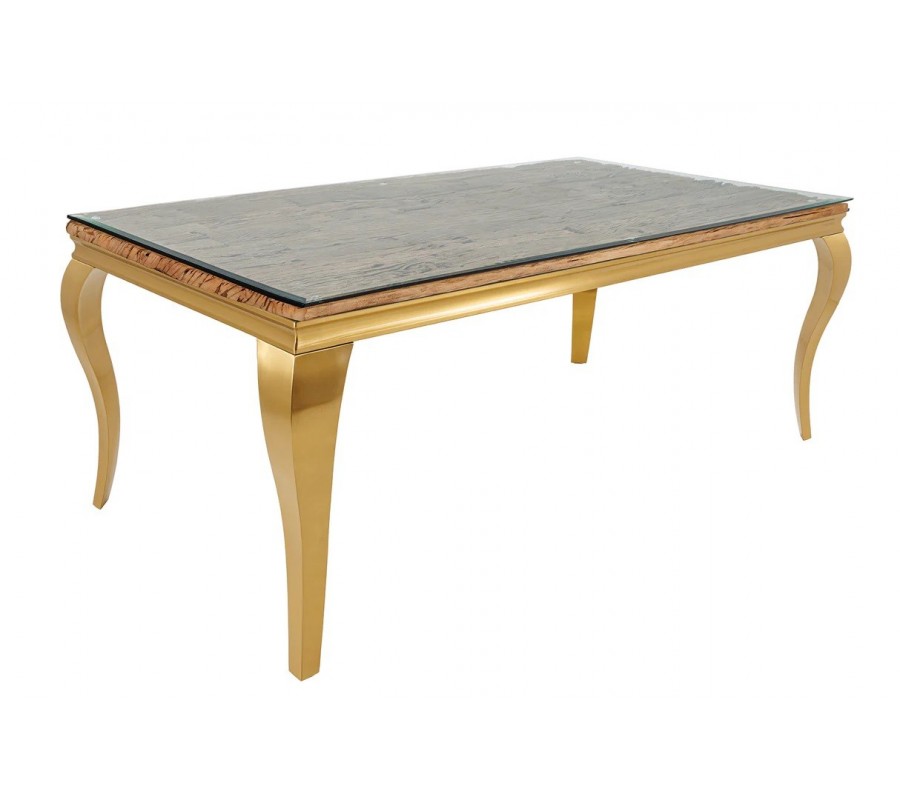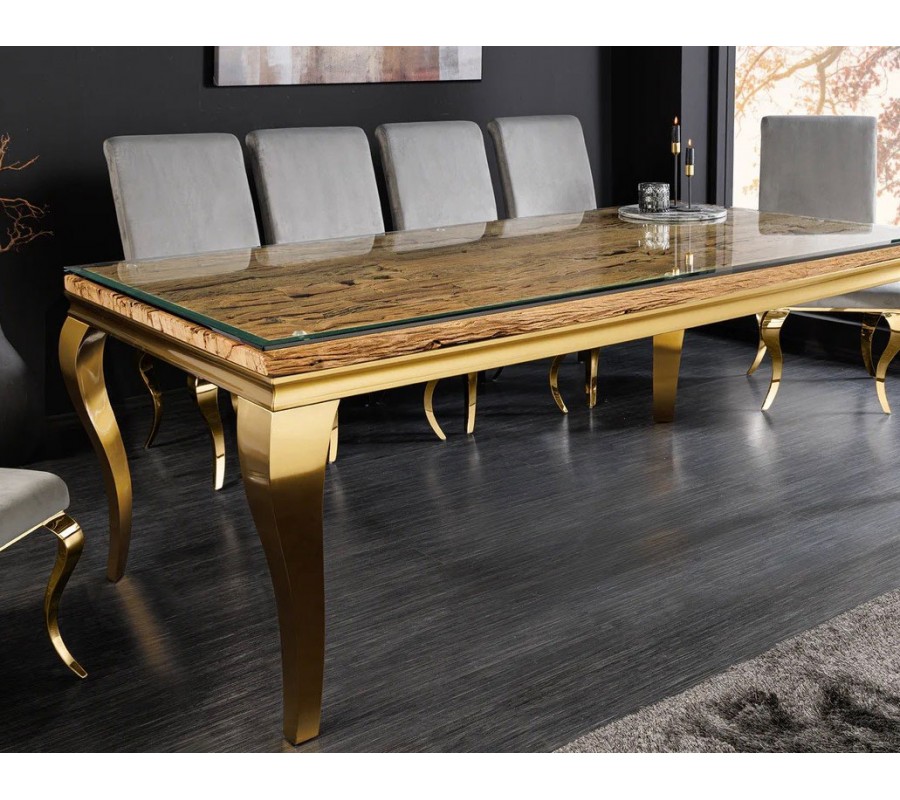 Jídelní sestava Modern Barock je navržena pro milovníky luxusního a reprezentativního interiéru. Dominantou je obdélníkový jídelní stůl s přírodním dřevěným akcentem a čirou skleněnou deskou, která působí vzdušně a elegantně. Jeho zlatá kovová konstrukce s charakteristickými kabriolovými nožičkami dodává celé sestavě noblesu a typický barokní nádech v moderním provedení.