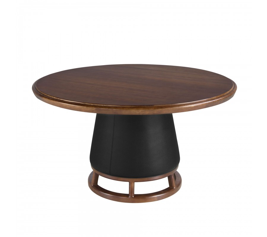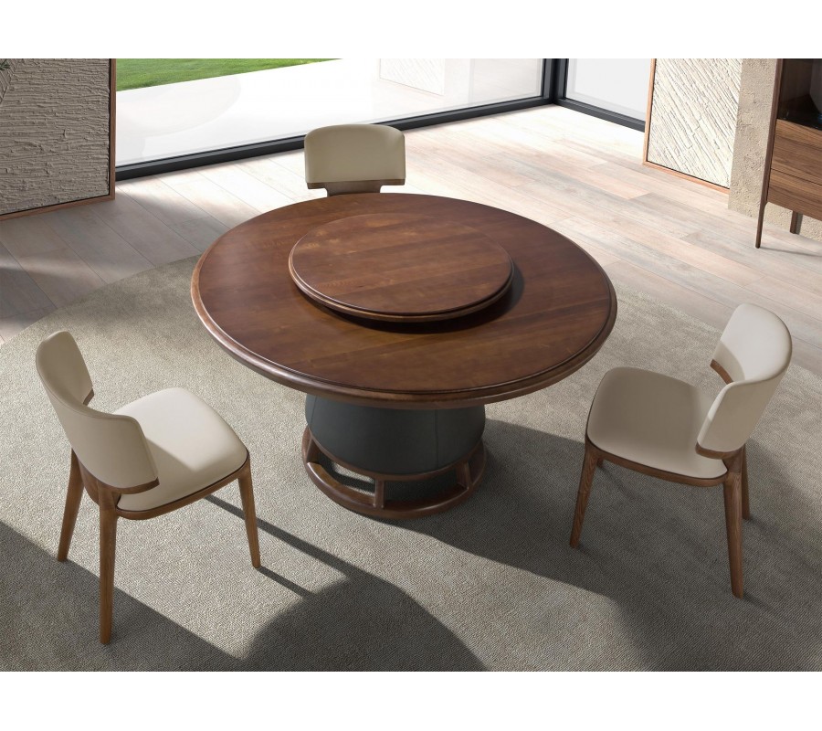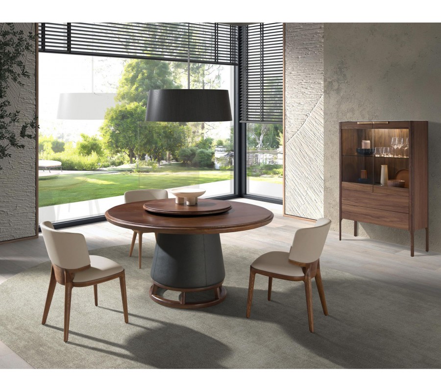V centru sestavy se nachází kulatý jídelní stůl s mohutnou nohou, který poskytne místo pro šest osob. Doplňuje jej praktický otočný podnos ve stejném provedení jako vrchní deska. Černý kožený potah nohy krásně kontrastuje se světlým krémovým potahem jídelních židlí, zatímco jejich dřevěná konstrukce a zakřivení zádové opěrky vizuálně navazuje na barvu a tvar stolu.